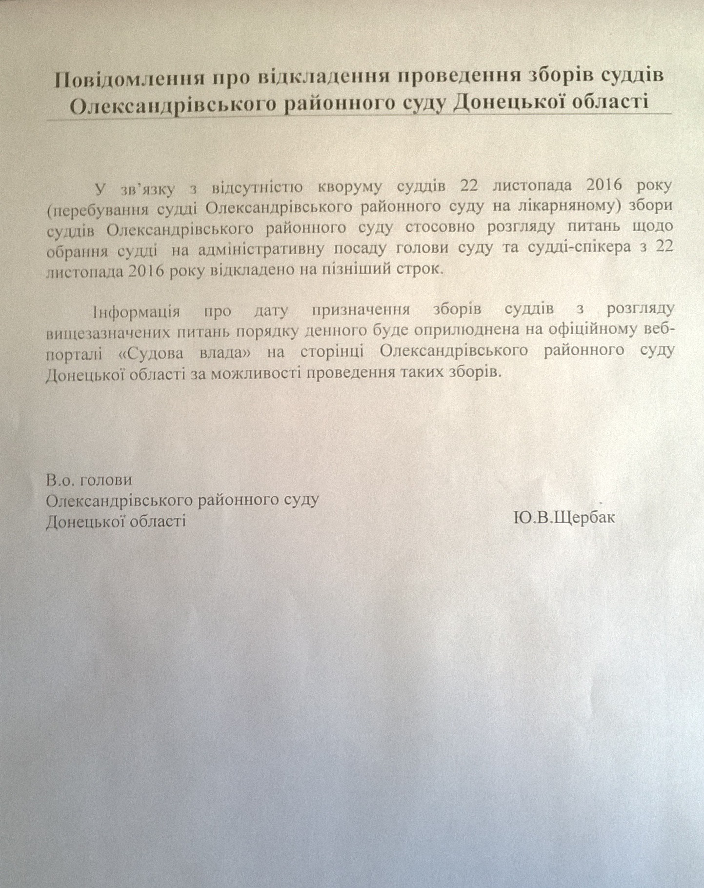 Повідомлення про відкладення проведення зборів суддів Олександрівського районного суду Донецької області