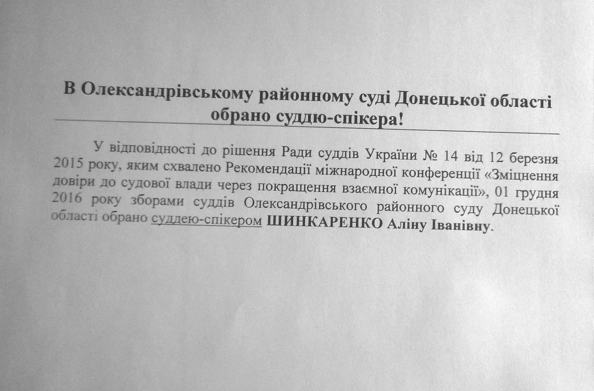 Обрано суддю-спікера Олександрівського районного суду Донецької області