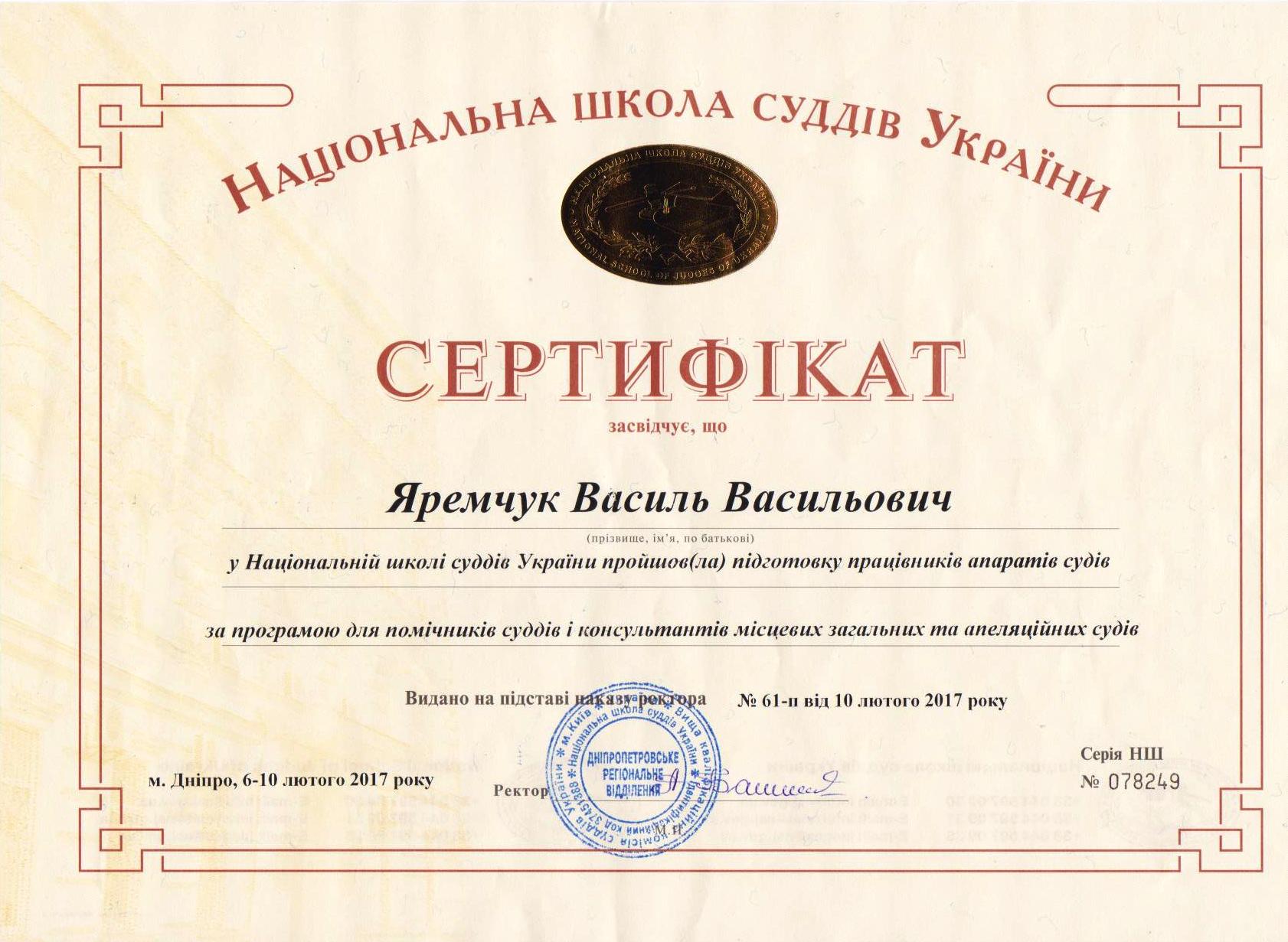 В період з 6 по 10 лютого 2017 року включно помічник судді Олександрівського районного суду Донецької області Яремчук В.В. в Дніпропетровському регіональному відділенні Національної школи суддів України пройшов підготовку працівників апаратів судів за програмою для помічників суддів і консультантів місцевих загальних та апеляційних судів.