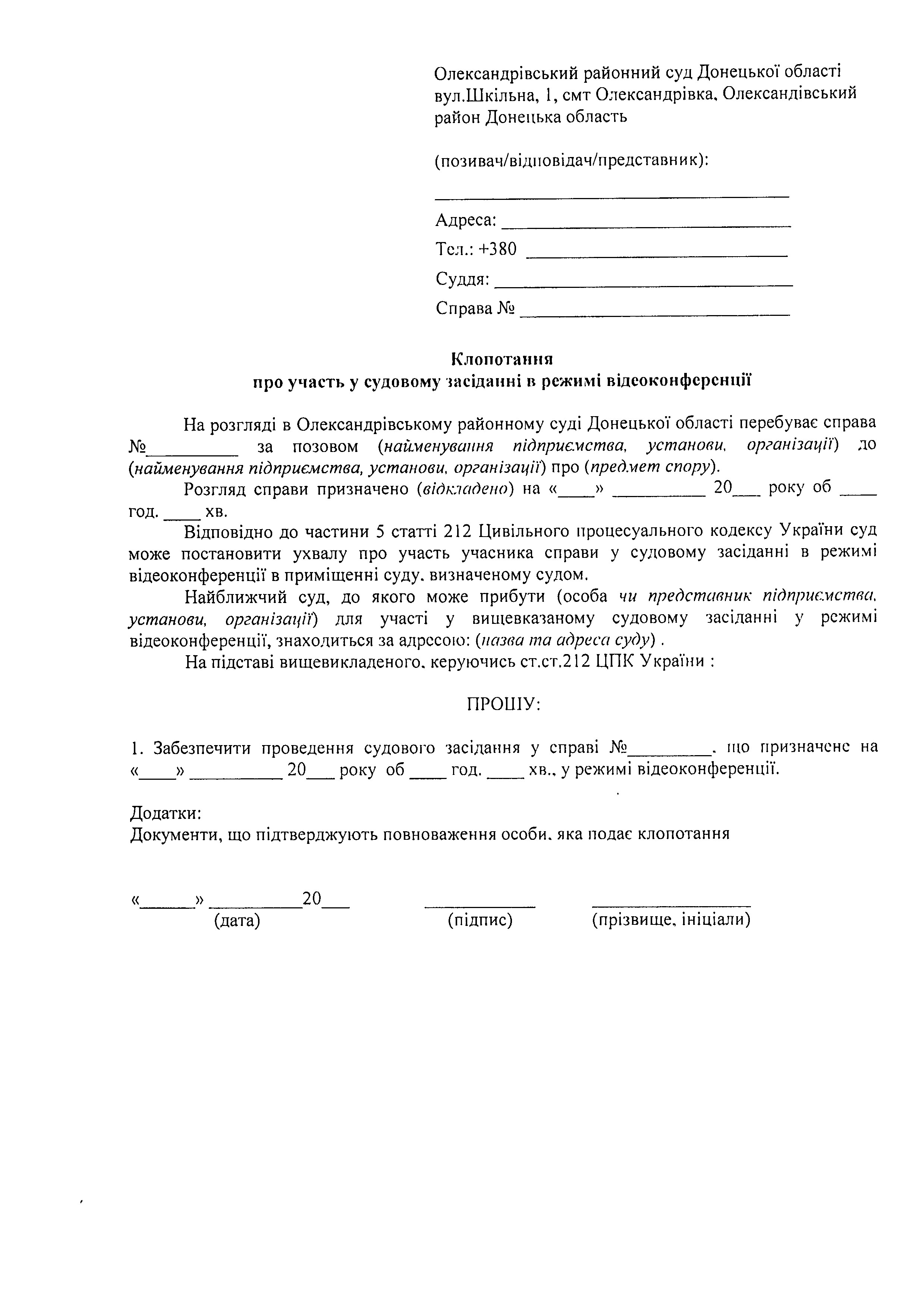 Клопотання про участь в судовому засіданні в режимі відеоконференції (ЦПК)