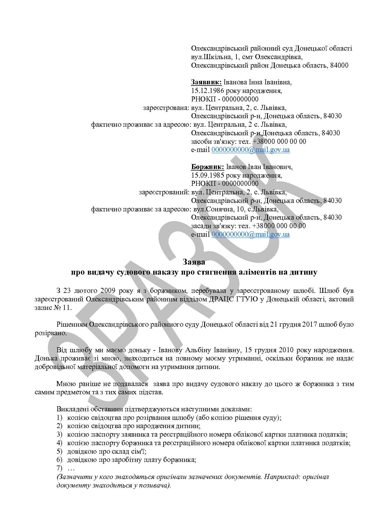 Заява про видачу судового наказу про стягнення аліментів на дитину