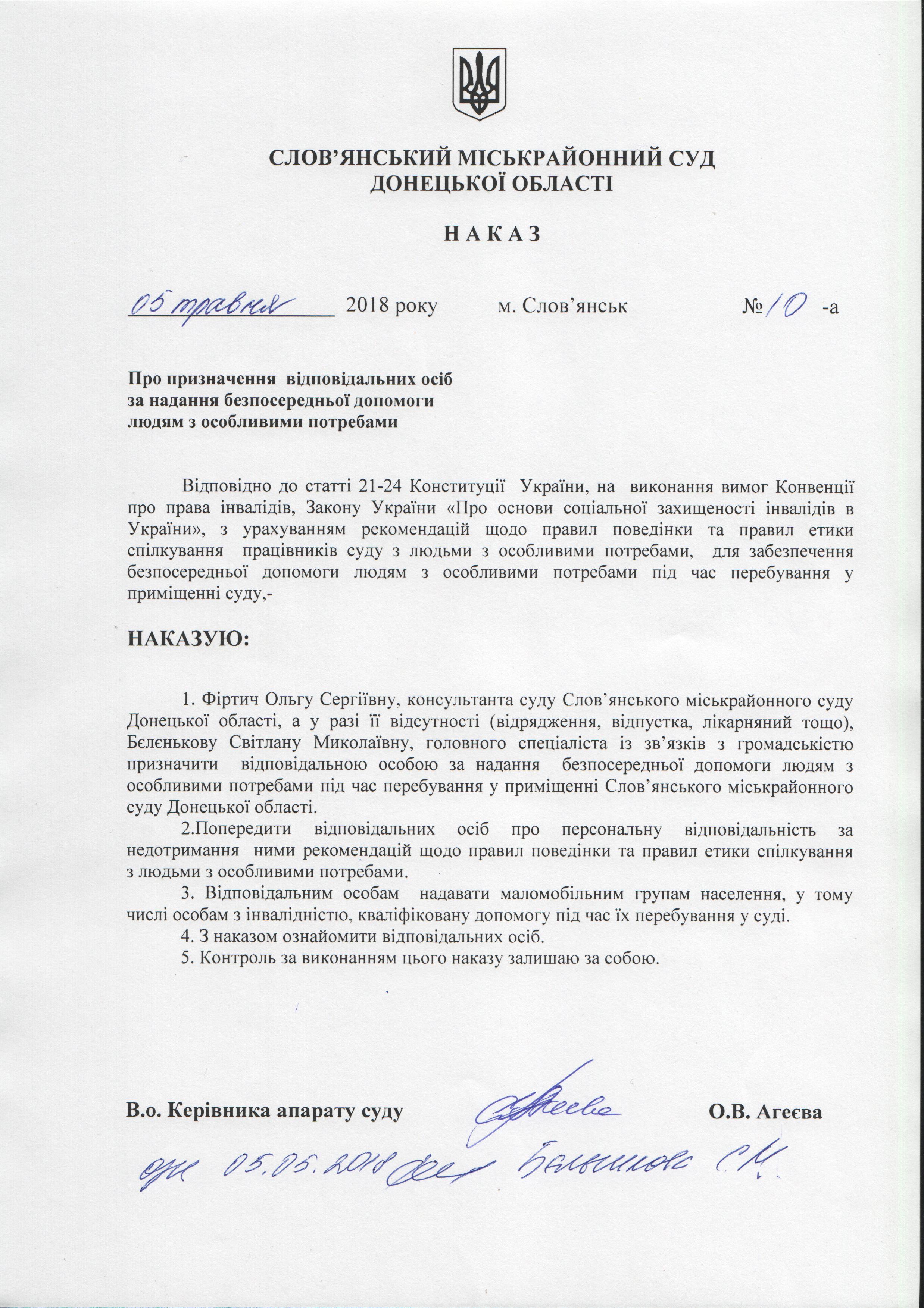 Фіртич Ольгу Сергіївну, консультанта суду Слов’янського міськрайонного суду Донецької області, а у разі її відсутності - Бєлєнькову Світлану Миколаївну, головного спеціаліста із зв’язків з громадськістю призначено відповідальними особами за надання маломобільним групам населення, у тому числі особам з інвалідністю, кваліфікованої допомоги під час їх перебування у приміщенні Слов’янського міськрайонного суду Донецької області.
