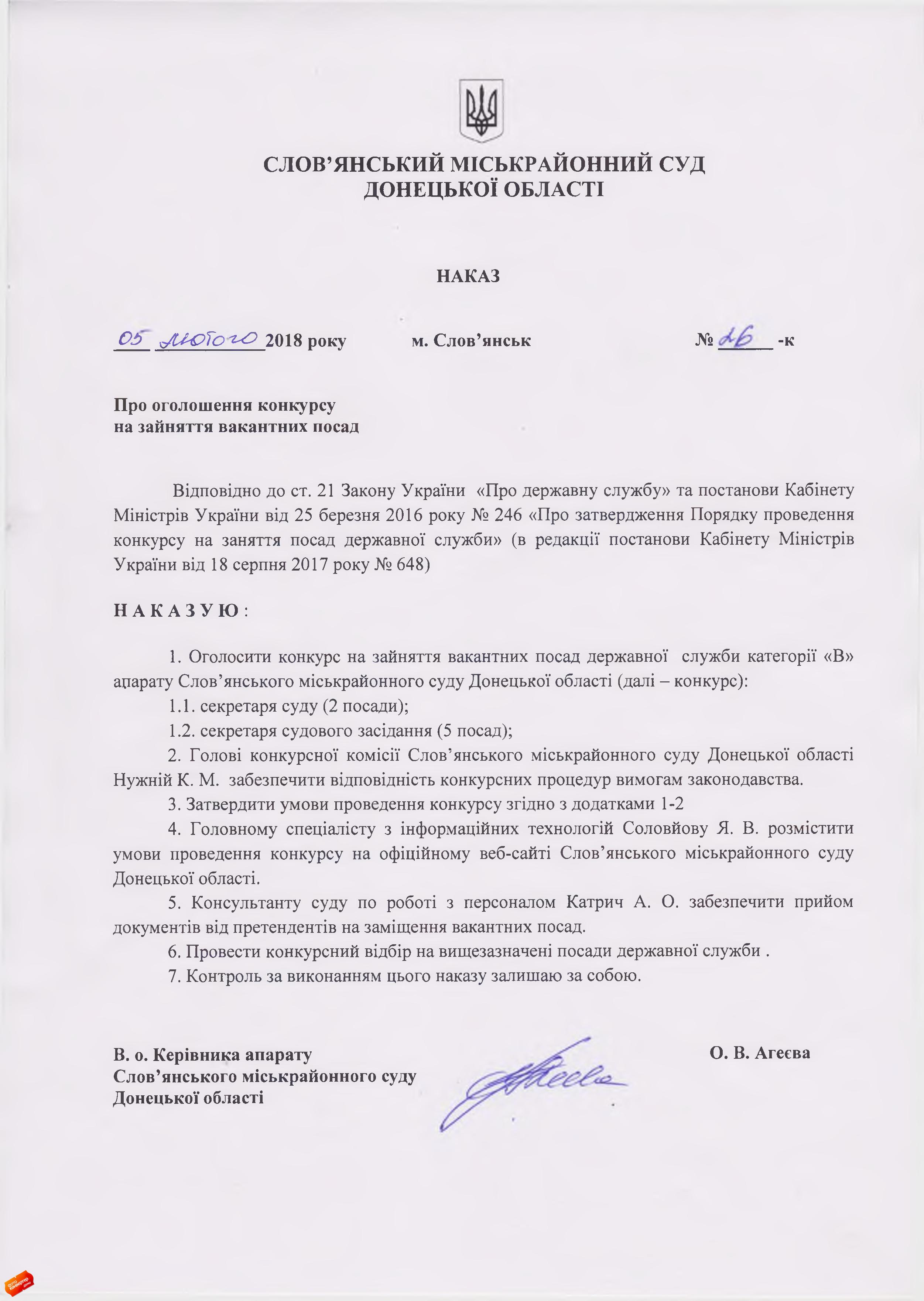 до наказу В. о. керівника апарату Слов’янського