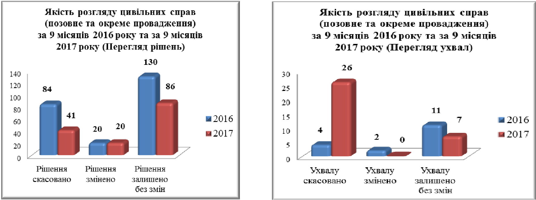 Незважаючи на надмірну завантаженість суддів, якість розгляду справ значно покращилась. Так, за 9 місяців 2016 року в порядку апеляційного провадження було скасовано близько 2% рішень по цивільним справам, а в 2017 році наведений показник склав 1,4% рішень. Загалом у 2017 році в порядку цивільного судочинства було скасовано 41 рішення та 26 ухвал (в 2016 році – 84 рішення та 4 ухвали), змінено 20 рішень (в 2016 році – 20 рішень та 2 ухвали) та залишено без змін 86 рішень та 7 ухвал (у 2016 році – 130 рішень та 11 ухвал).