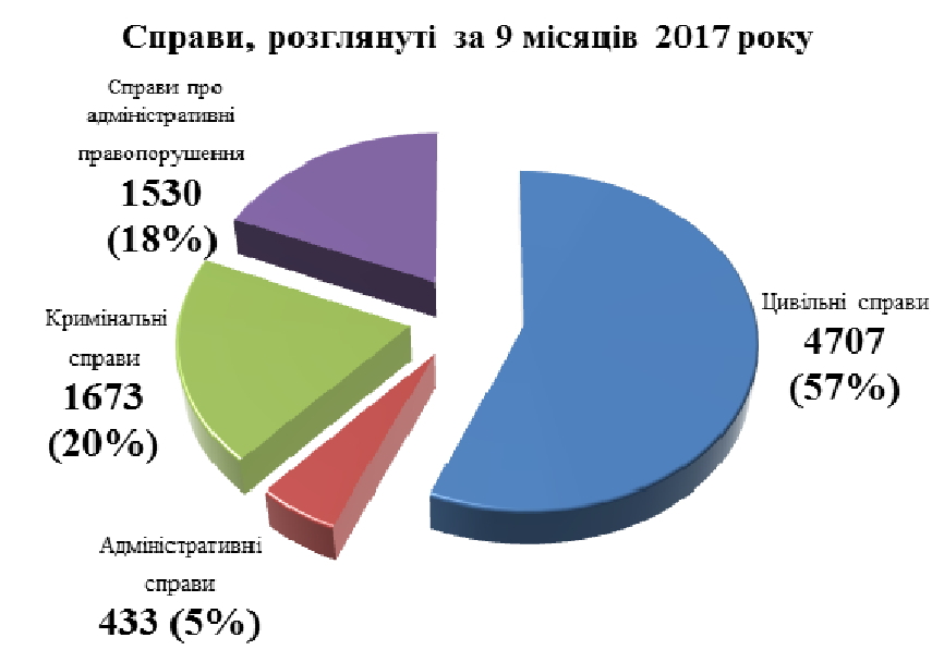Так, у 2017 році було розглянуто 4707 цивільних справ (у 2016 цей показник становив лише 4141 справа), 1673 кримінальних справ (1539 справ у 2016 році), 433 адміністративні справи (233 у 2016 році) та 1530 справ про адміністративні правопорушення (1453 справи у 2016 році).