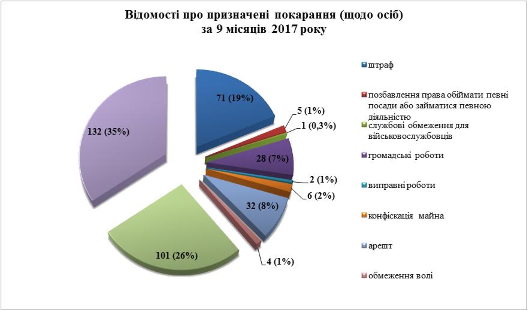 Впродовж 9 місяців 2017 року процентне співвідношення частки кожного виду покарань в загальній сукупності обвинувачених вироків змінилась несуттєво. Так, покарання у вигляді позбавлення волі на певний строк – у 26% випадків, 17% - штраф, 8% - арешт та 7% - громадські роботи. Інші види покарання було призначено у менш ніж 2% вироків.