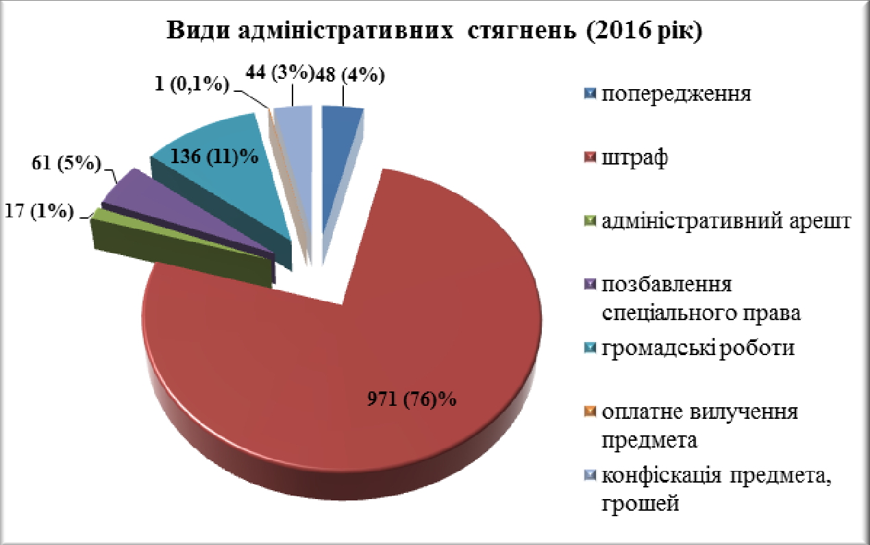 За результатами розгляду справ про адміністративні правопорушення найчастіше покарання за 9 місяців 2016 року призначалося у вигляді штрафу – 76%. Покарання у вигляді громадських робот та позбавлення спеціального права було призначене у 11% та 5% рішень відповідно.