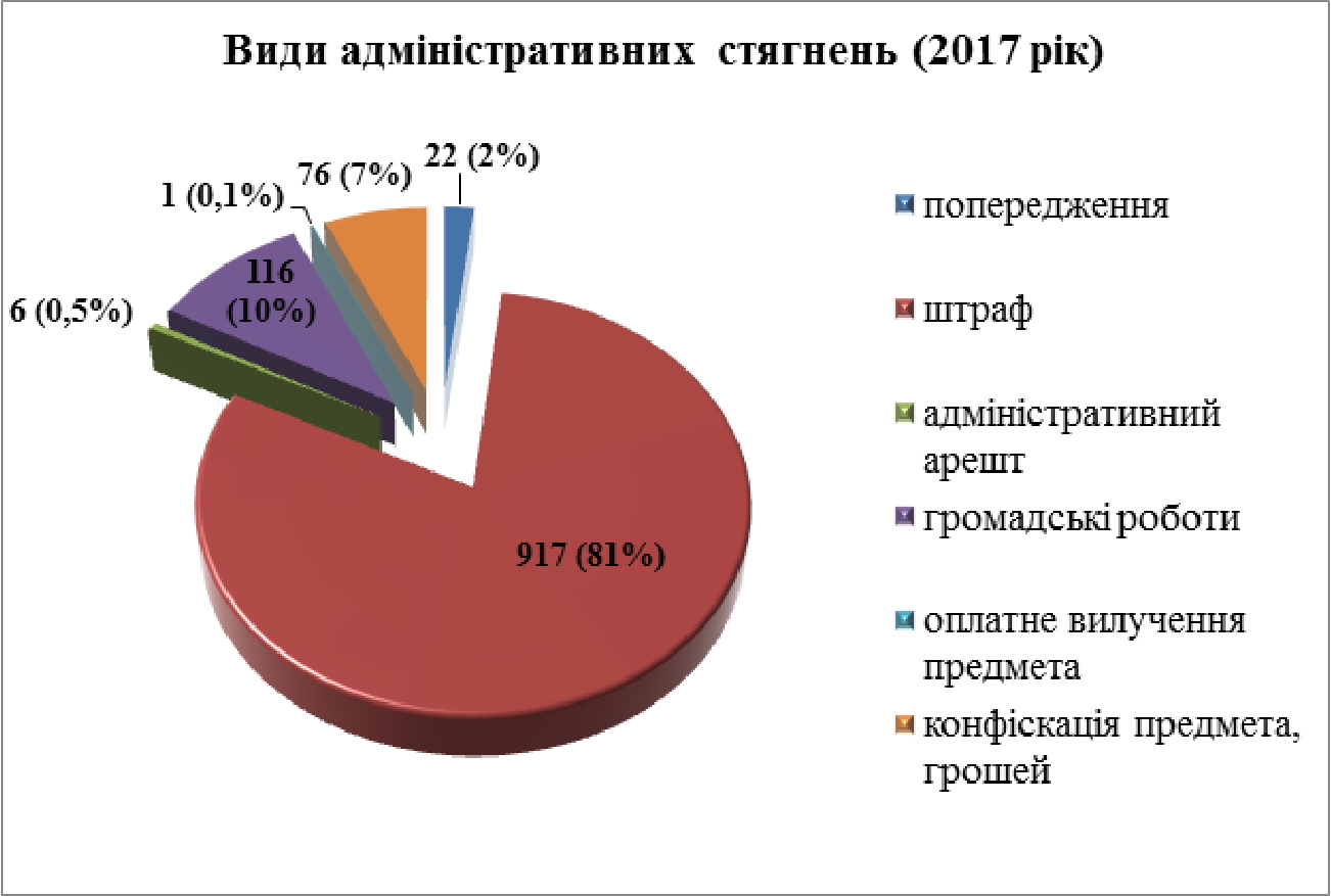 За 9 місяців 2017 року дещо зріс показник призначення адміністративного стягнення у вигляді штрафу та склав 81%. Громадські роботи застосовувалися у 10% рішень та у 7% за рішенням суду було застосовано конфіскацію майна.
