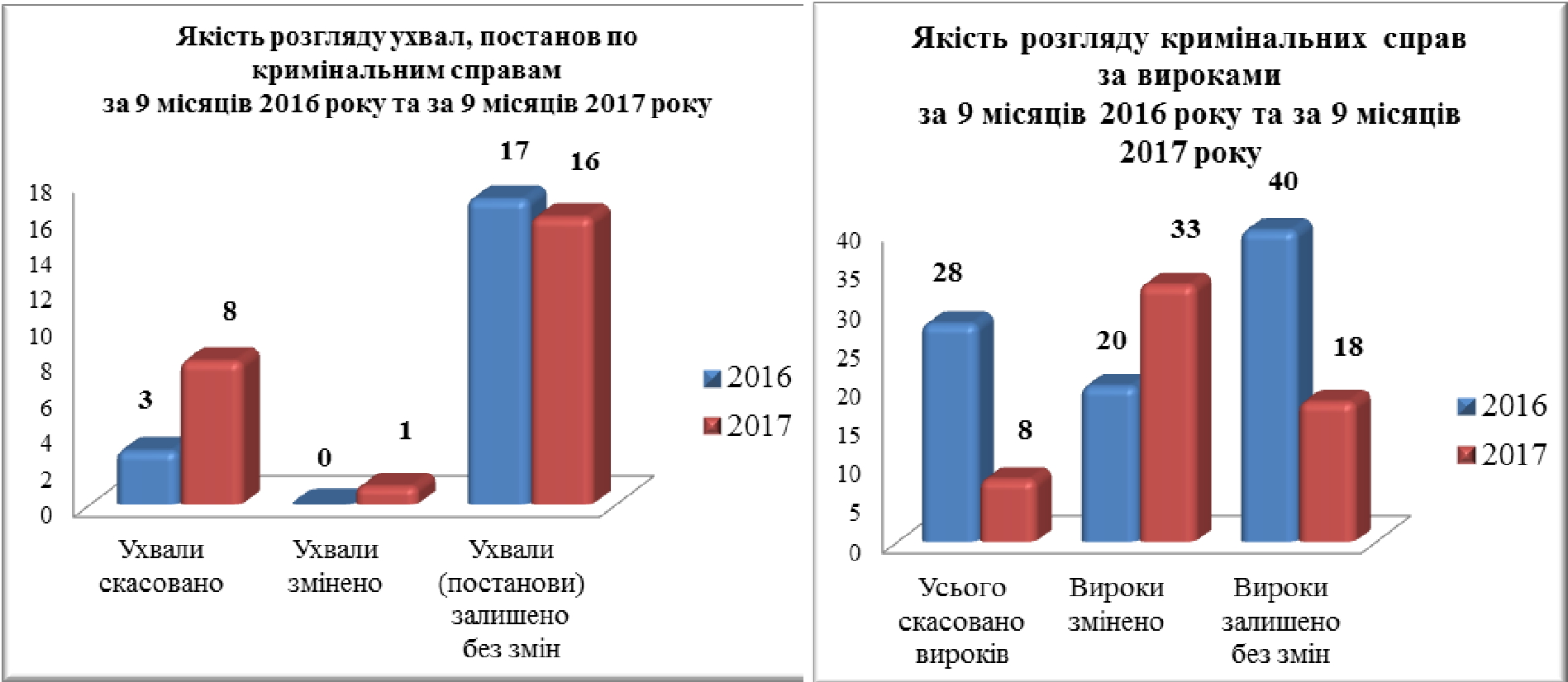 Впродовж трьох кварталів 2016 року було скасовано 1,6% вироків та 0,8% постанов і ухвал по кримінальним провадженням. За січень-вересень 2017 року в порядку апеляційного провадження було скасовано 0,5% вироків та 0,5% постанов і ухвал по кримінальним провадженням: за 9 місяців 2017 року скасовано 8 та змінено 33 вироків, в той час як за аналогічний період 2016 року було скасовано 28 вироків та змінено 20.