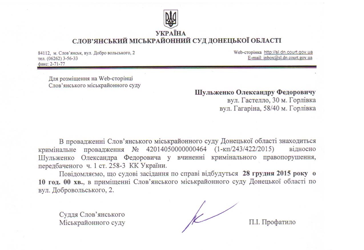 Оголошення по справі 1-кп/243/422/2015 відносно Шульженко Олександра Федоровича на 28.12.2015