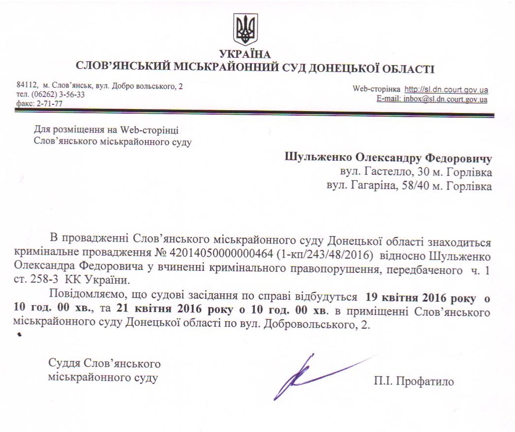 Виклик по справі 1-кп/243/48/2016 Шульженко О.Ф на 21.04.2016 10:00