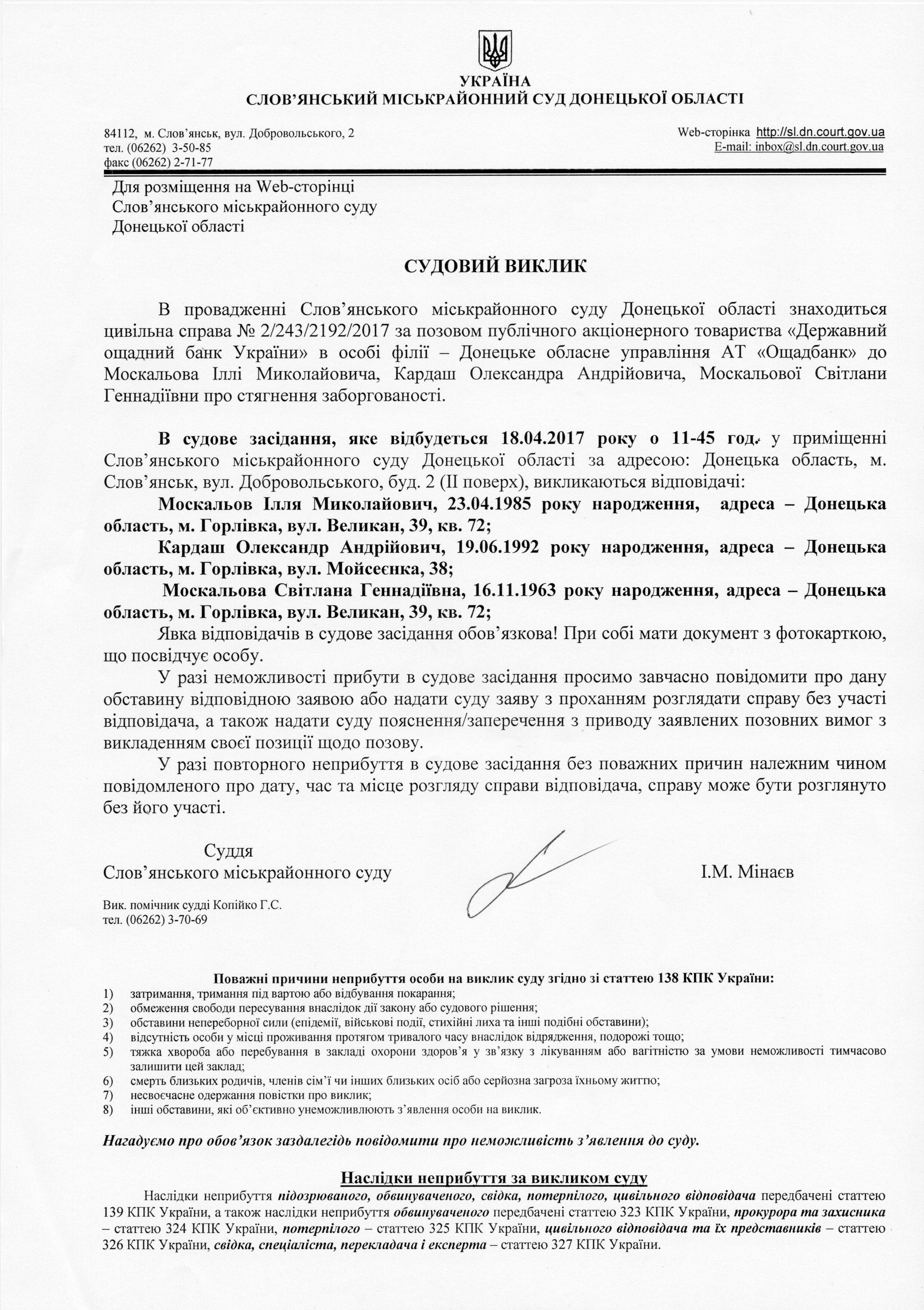 Оголошення по цивільній справі №2/243/2192/2017 за позовом ПАТ "Державний ощадний банк України"