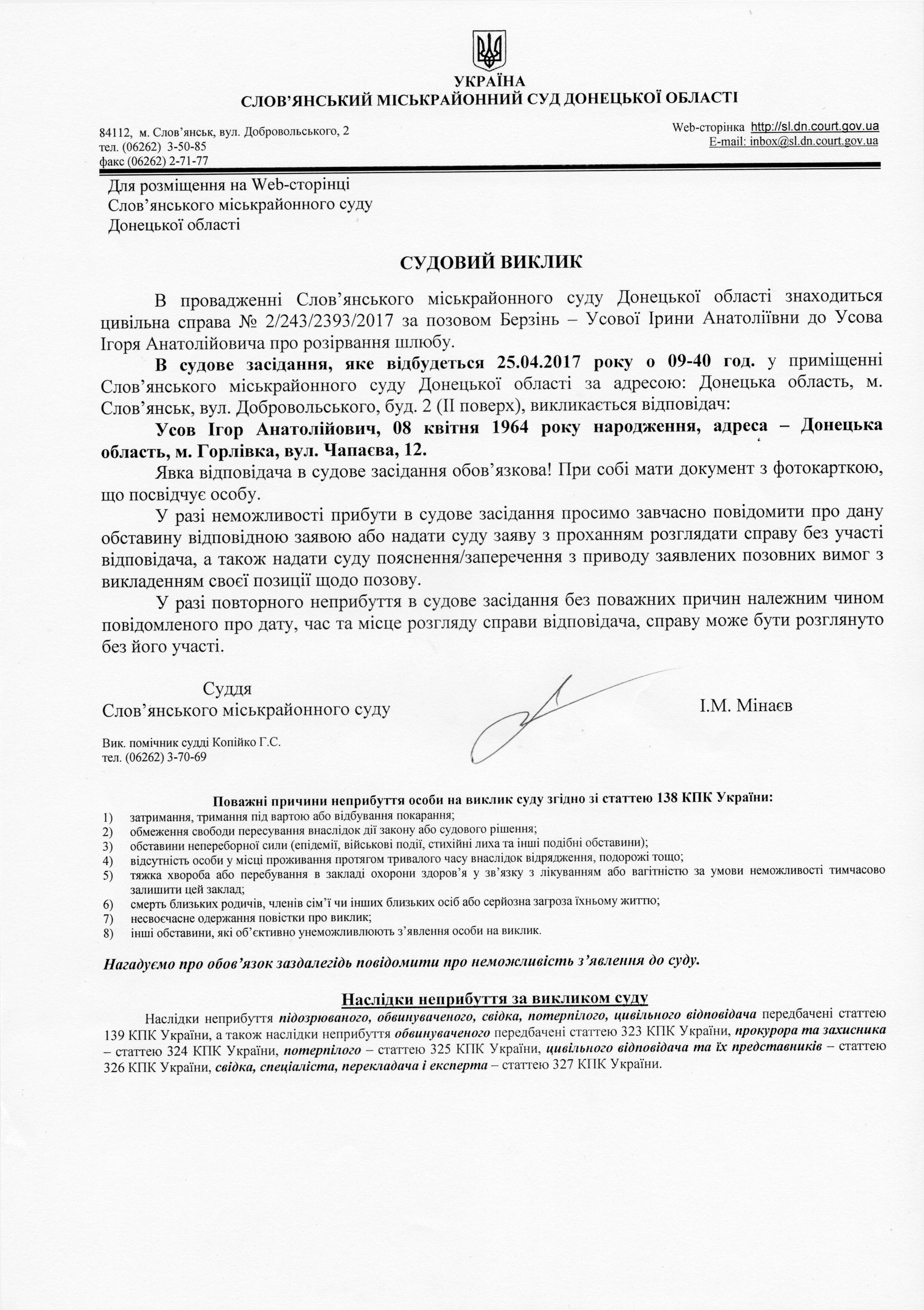 Оголошення по цивільній справі №2/243/2393/2017 за позовом Берзінь-Усової Ірини Анатоліївни до Усова Ігоря Анатолійовича про розірвання шлюбу.