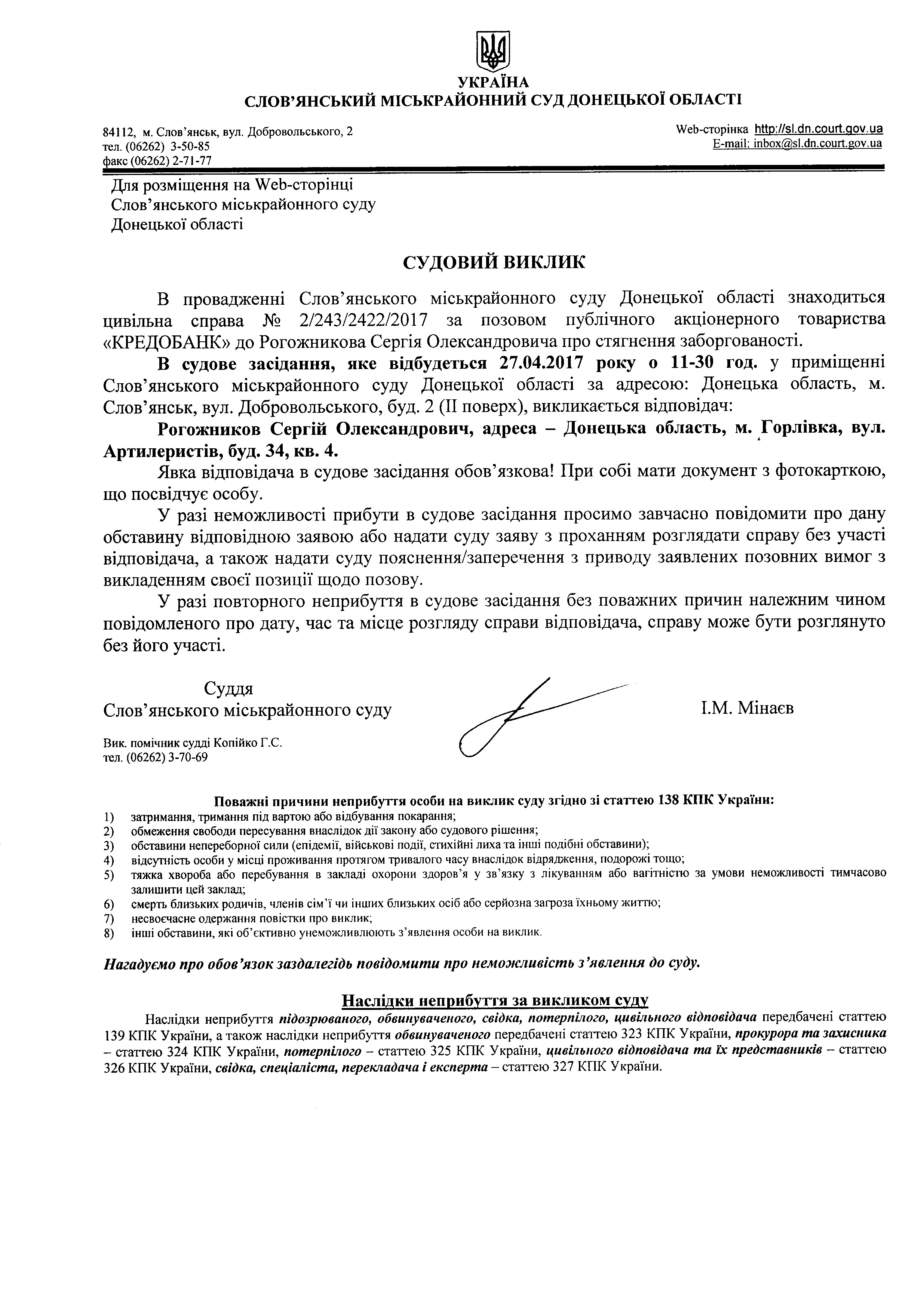 Оголошення по цивільній справі № 2/243/2422/2017 за позовом ПАТ "Кредобанк" до Рогожникова С.О. про стягнення заборгованності.