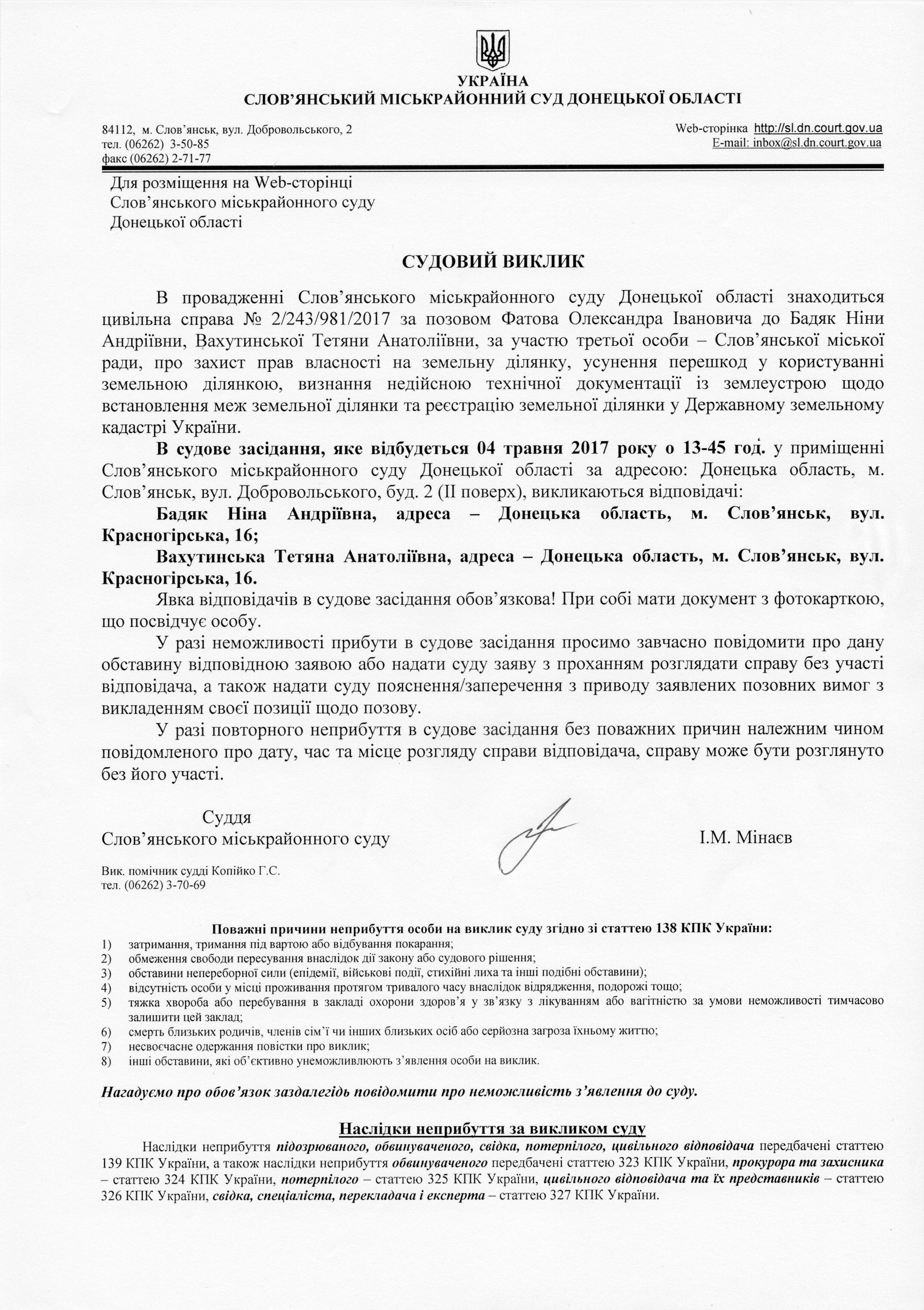 Оголошення по справі №2/243/981/2017 за позовом Фатова О.І. до Бадяк Н.А., Вахутинської Т.А.