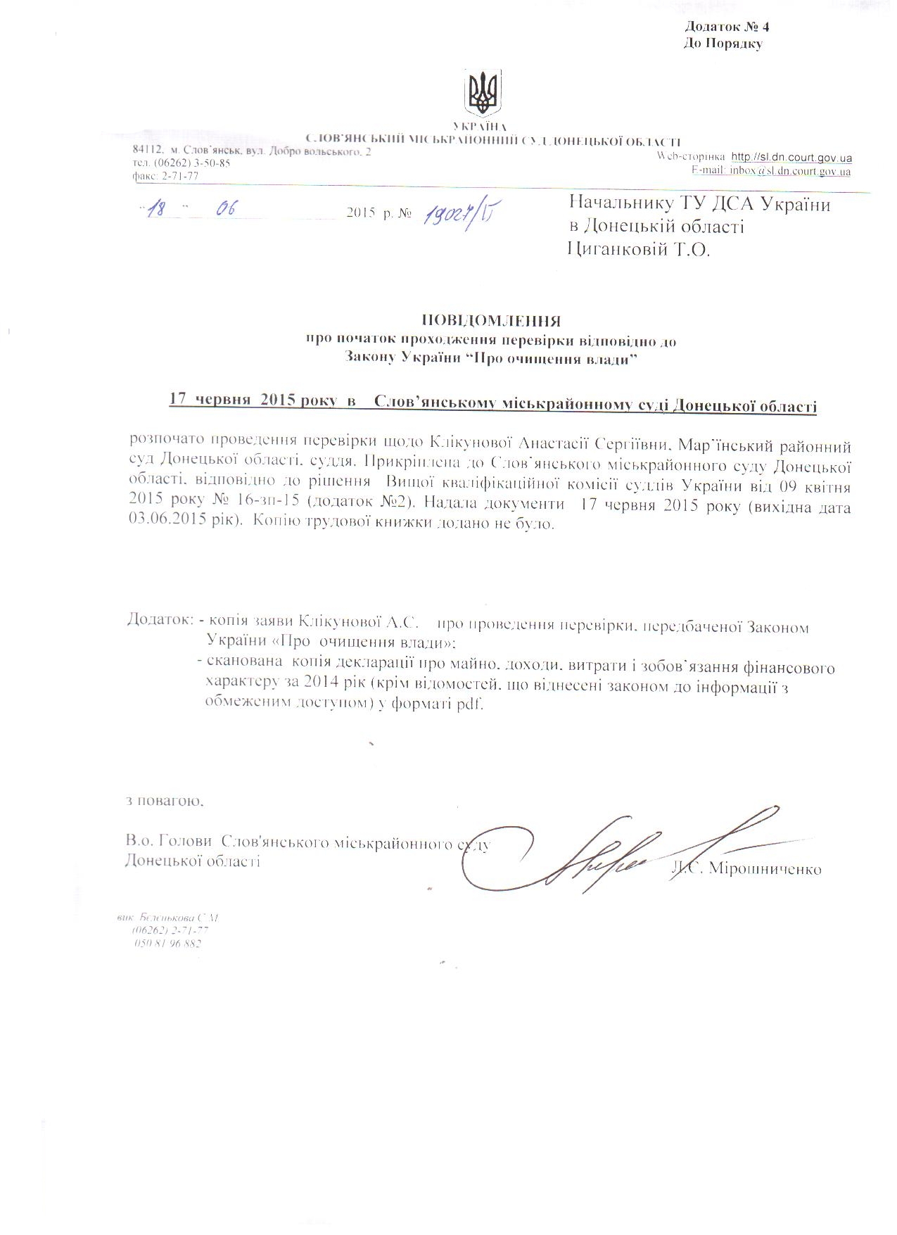 Повідомлення начальнику ТУ ДСА про початок проходження перевірки відповідно до Закону України Про очищення влади