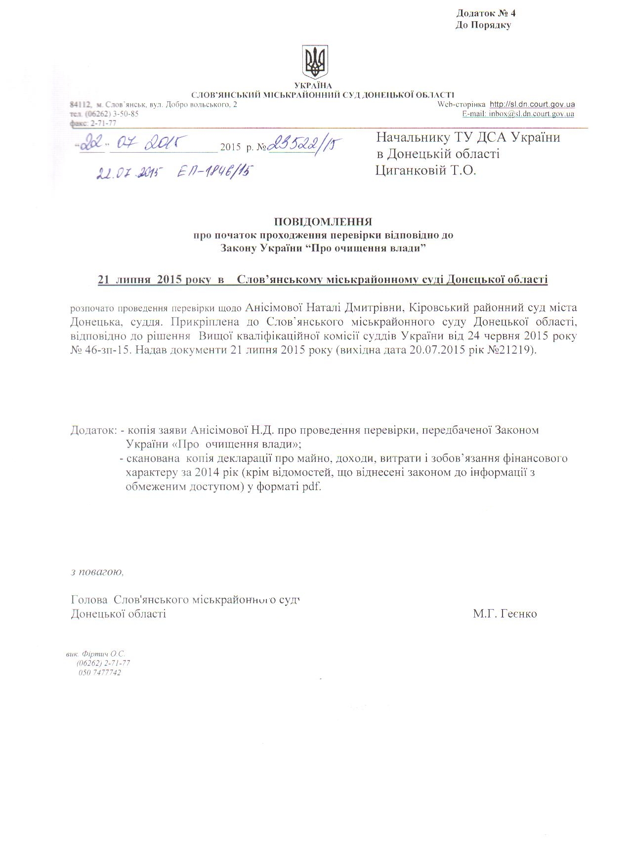 Повідомлення про початок проходження перевірки відповідно до Закону України "Про очищення влади" ТУ ДСА
