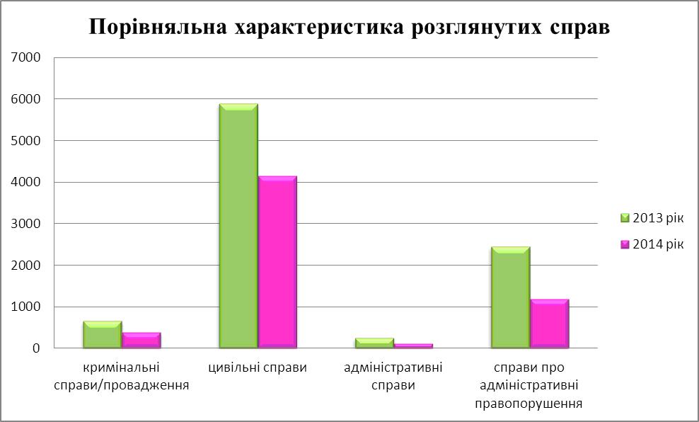 Структура загального об’єму справ, розглянутих судом у 2014 році, та динамічні показники розгляду справ у порівнянні з тим самим періодом 2013 року наведено у наступних діаграмах.