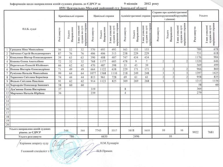 Інформація щодо направлення копій судових рішень до ЄДРСР у січні - вересні 2012 року