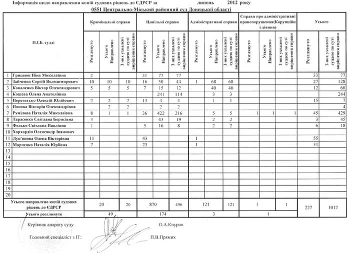 Інформація щодо направлення копій судових рішень до ЄДРСР у липні 2012 року