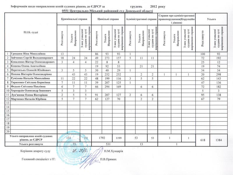 Інформація щодо направлення копій судових рішень до ЄДРСР у грудні 2012 року