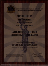 Всеукраїнська громадська організація «Асоціація українських правників» За результатами Першої громадської експертизи офіційних веб-сайтів судів загальної юрисдикції «Доступ до правосуддя» 25.06.2013р Апеляційний суд Донецької області нагороджено Дипломом ІІІ ступеня. |