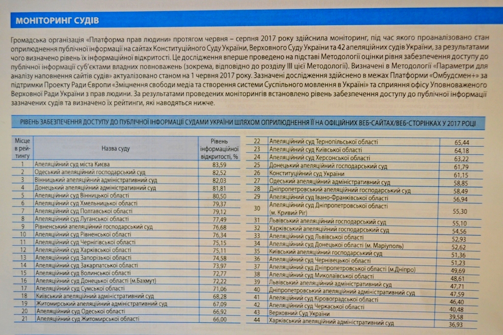 Під час конференції відбулась презентація та обговорення результатів моніторингу та оцінки рівня забезпечення доступу до публічної інформації суб’єктами владних повноважень у 2017 році, проведеного громадськими організаціями у співпраці з Секретаріатом Уповноваженого Верховної Ради з прав людини у рамках платформи «Омбудсмен плюс», у тому числі оцінки 44 веб-сайтів/сторінок українських судів, а саме: Конституційного Суду України, Верховного Суду України, апеляційних судів областей і м. Києва та апеляційних господарських і апеляційних адміністративних судів.