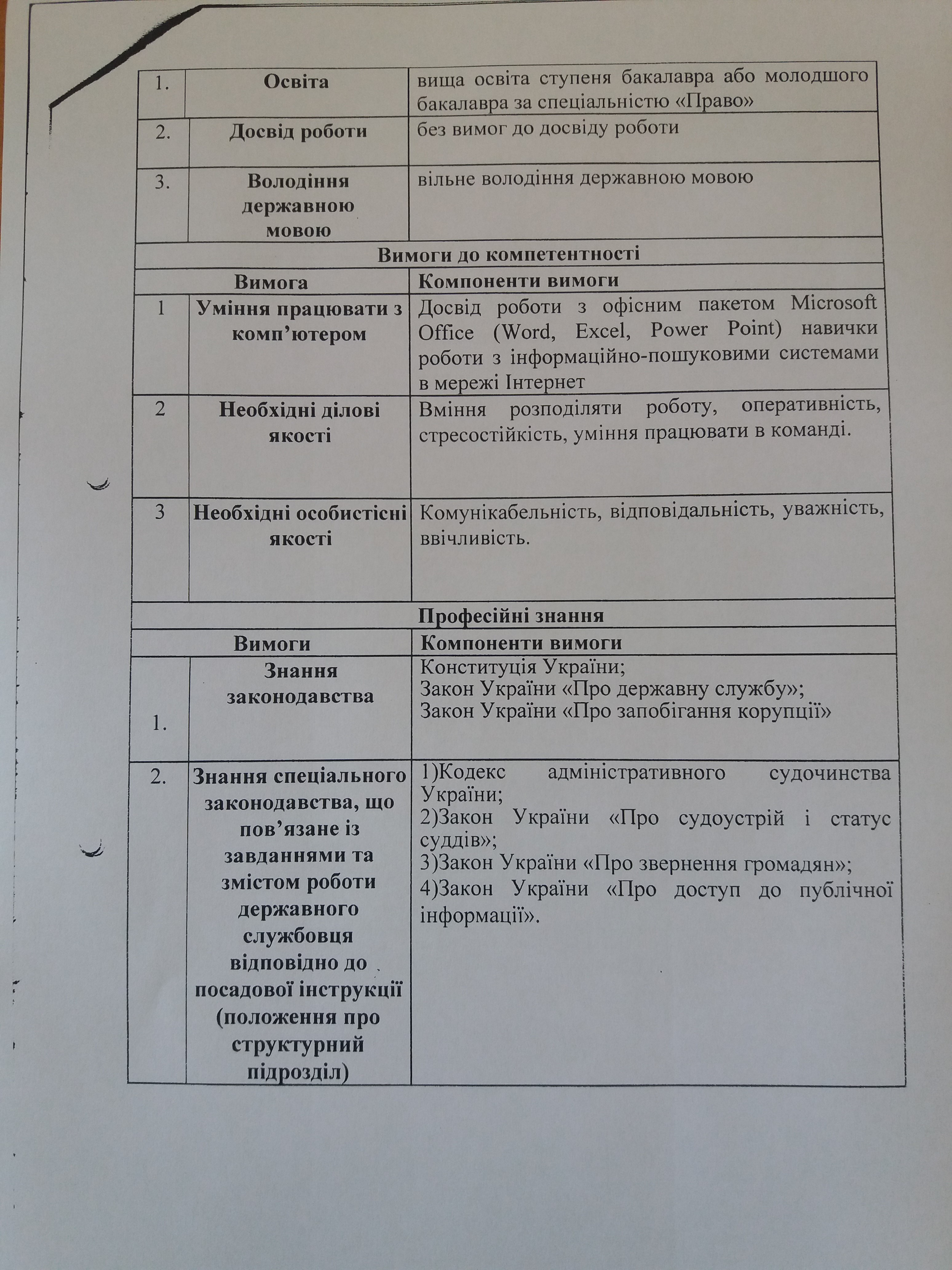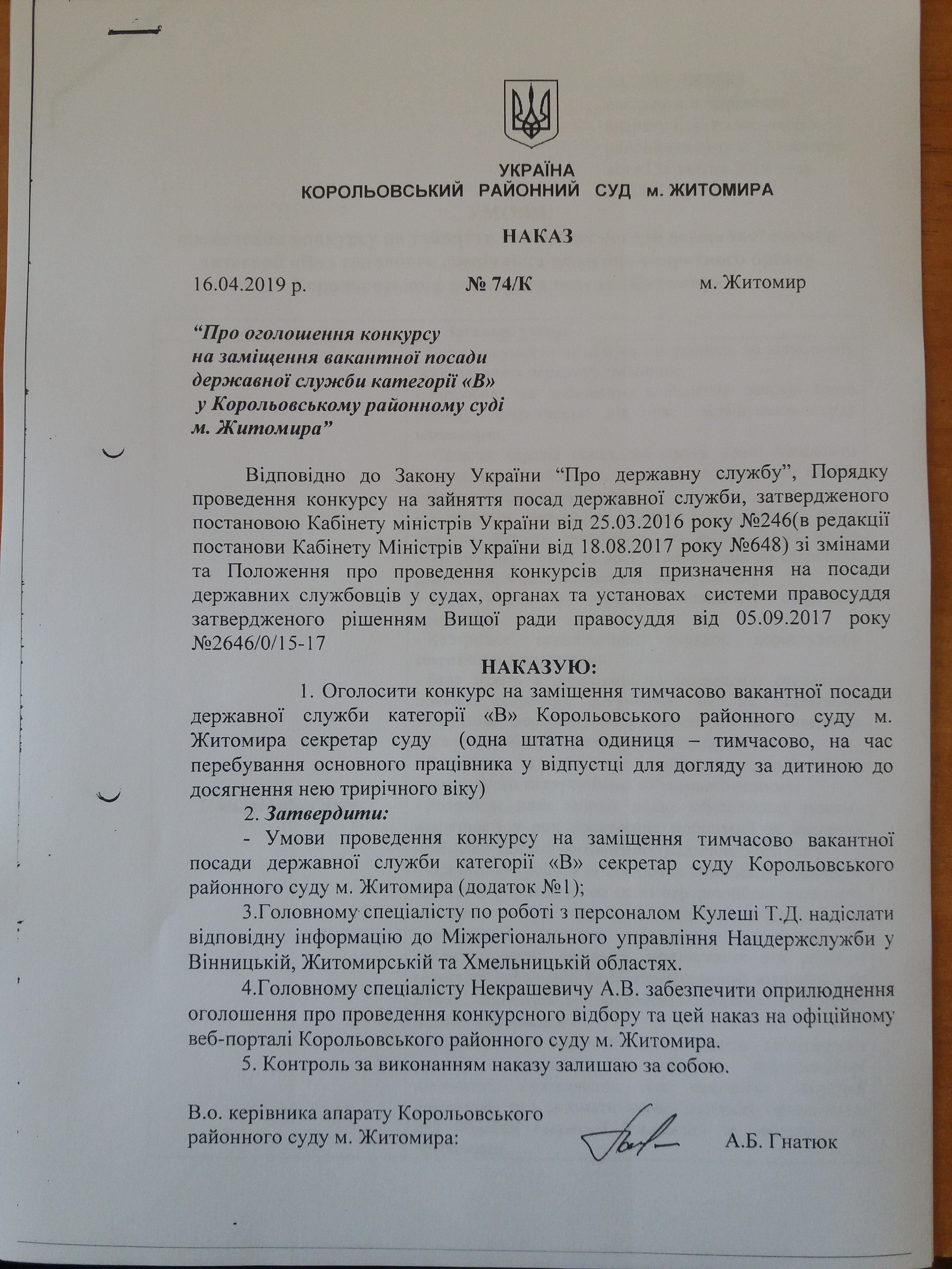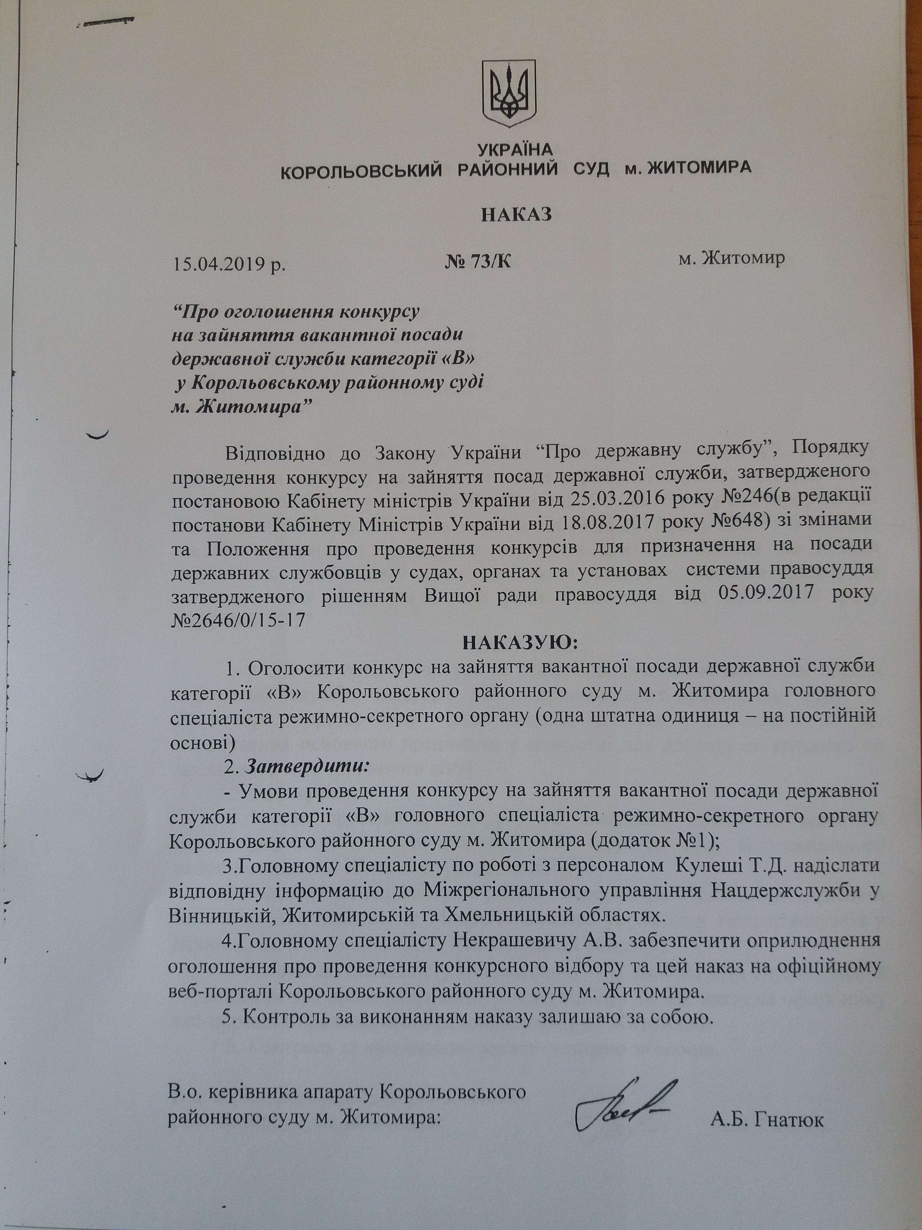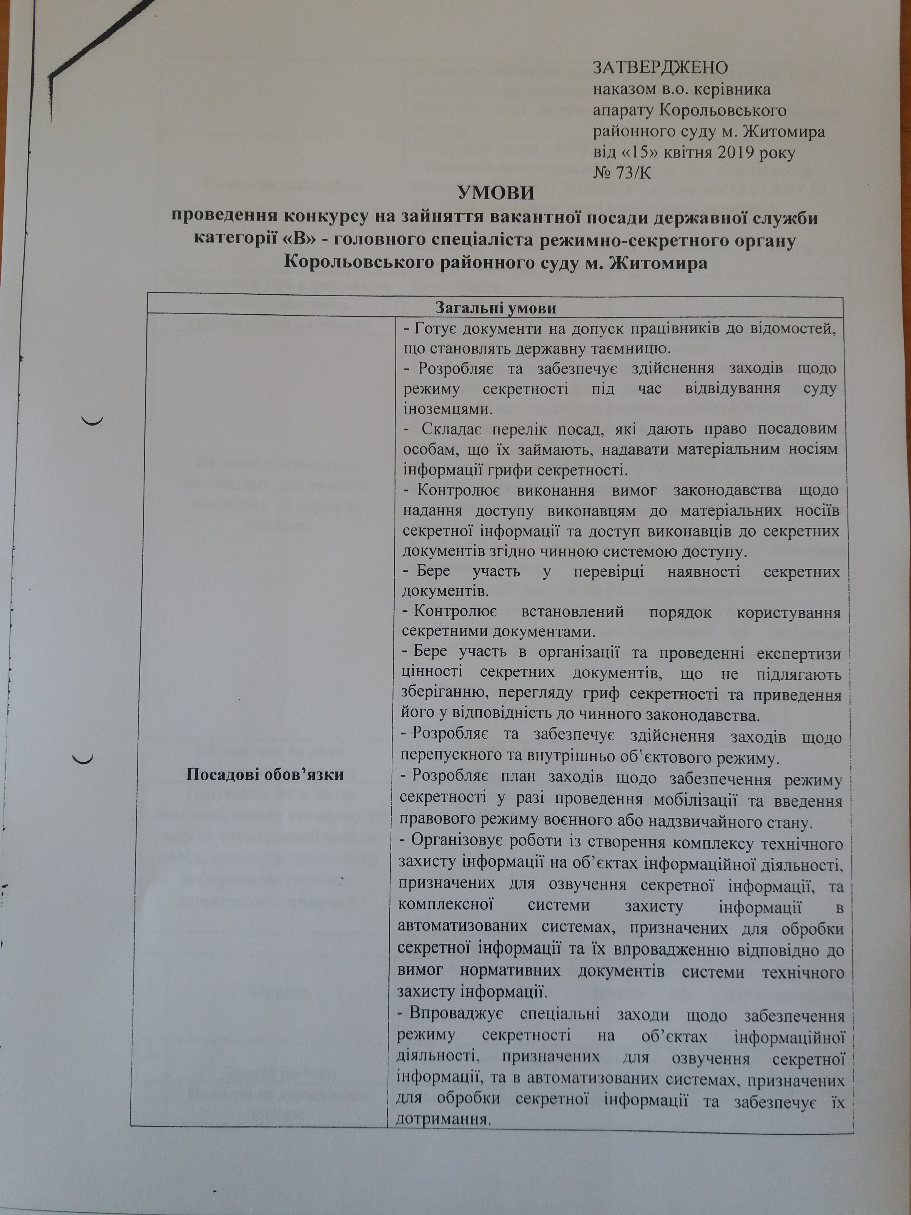 Корольовський районний суд м. Житомира оголошує конкурс на заміщення однієї тимчасово вакантної посади секретар суду (на період відпустки основного працівника для догляду за дитиною до досягнення нею трирічного віку) та зайняття вакантної посади головного спеціаліста режимно-секретного органу.