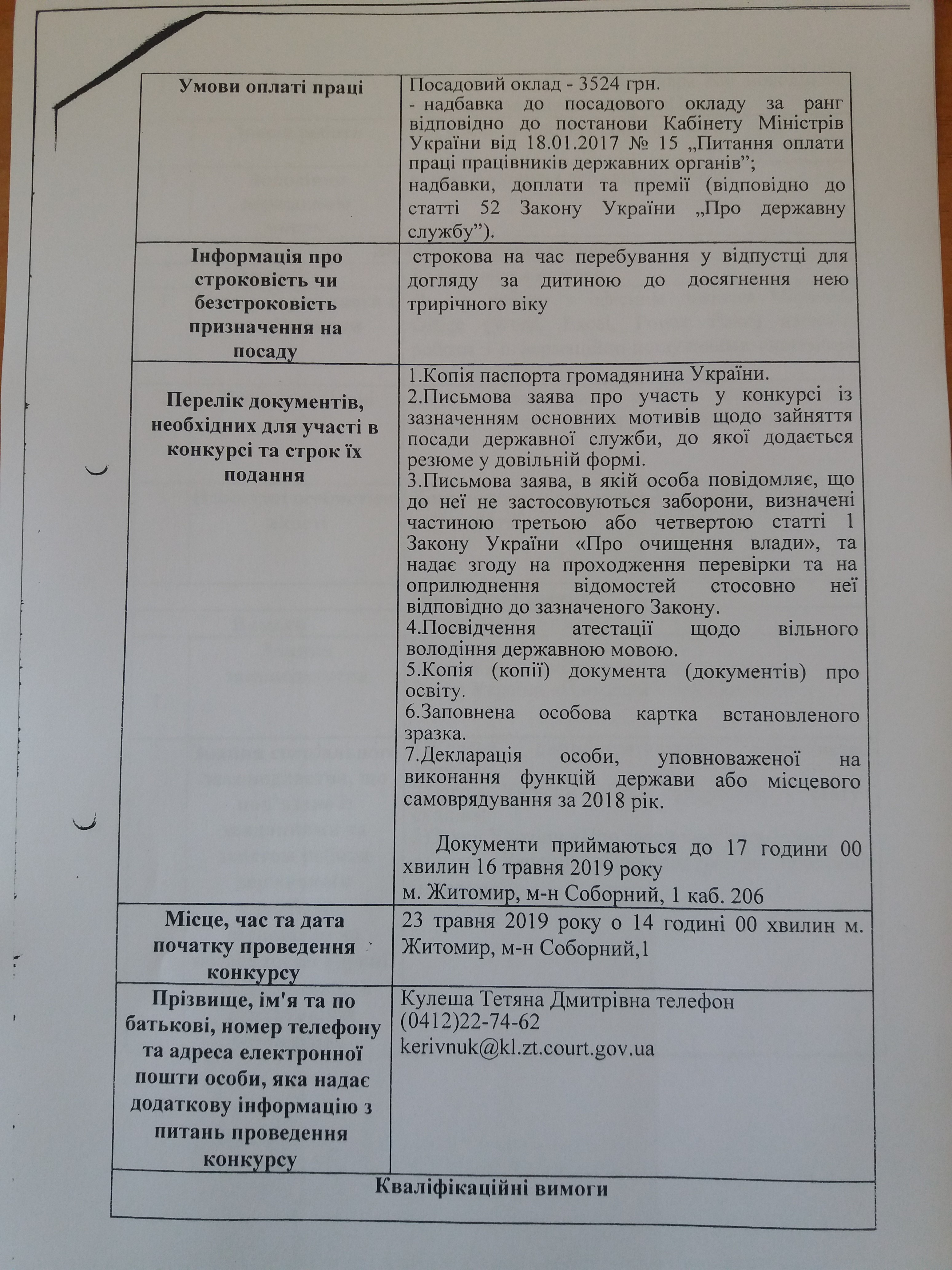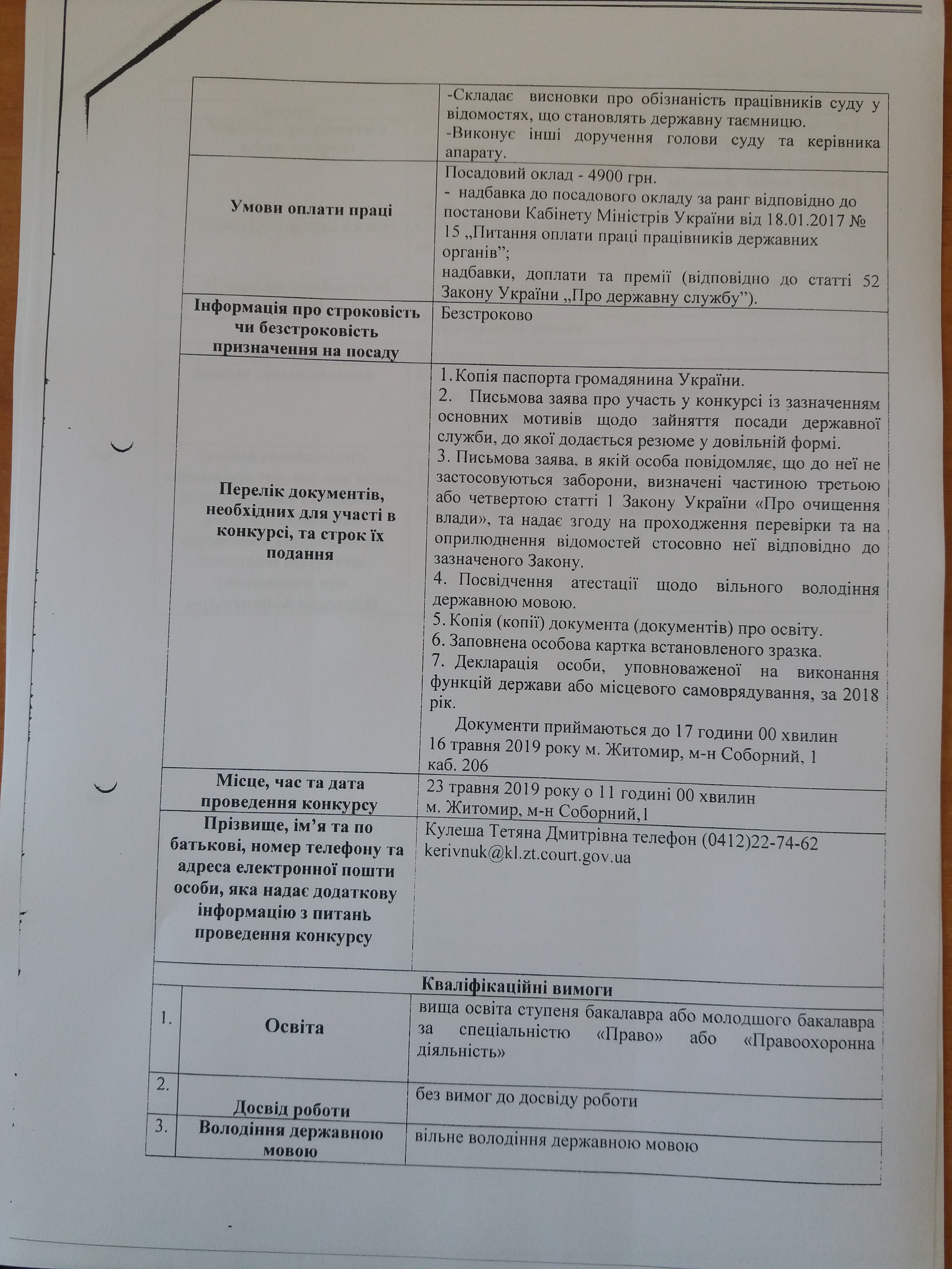 Дата, час і місце проведення конкурсу: 23 травня 2019 року о 11:00 год (головний спеціаліст режимно-секретного органу) та 23 травня 2019 року о 14:00 год (секретар суду)., м. Житомир майдан Соборний, 1, каб.206.