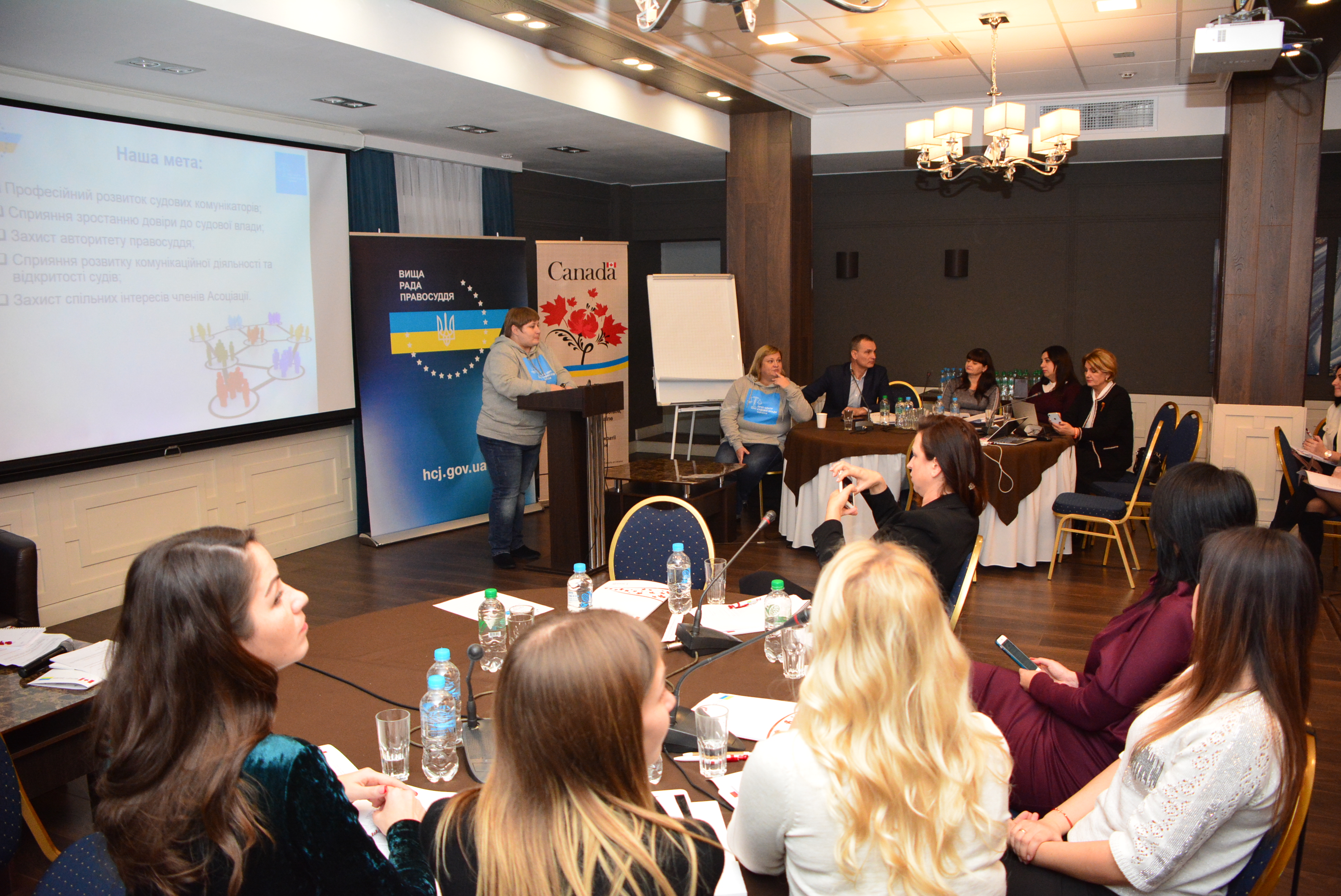 Із вітальним словом до учасників звернулися керівник Пресцентру судової влади України Оксана Лисенко та координатор із питань комунікацій Українсько-канадського Проекту підтримки судової реформи Дмитро Шинкарук.