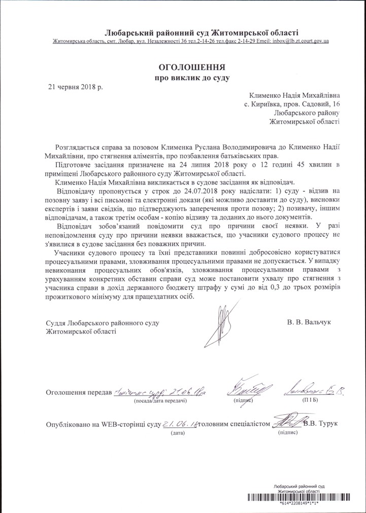 ОГОШЕННЯ про виклик до суду Клименко Надію Михайлівну