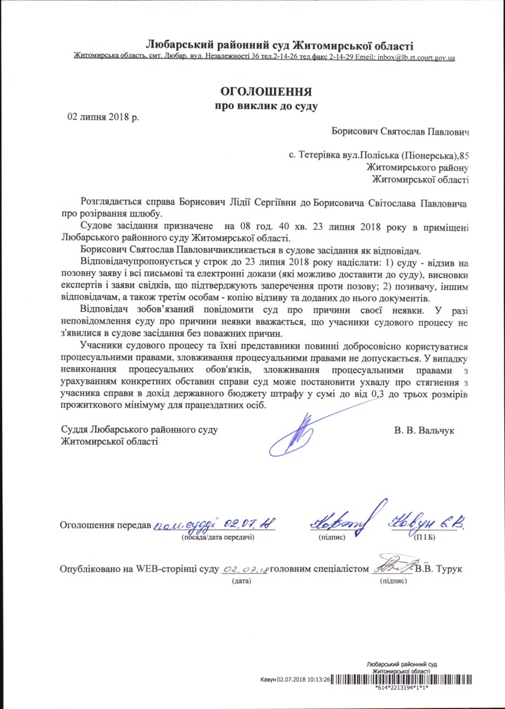 ОГОШЕННЯ про виклик до суду Борисовича Святослава Павловича