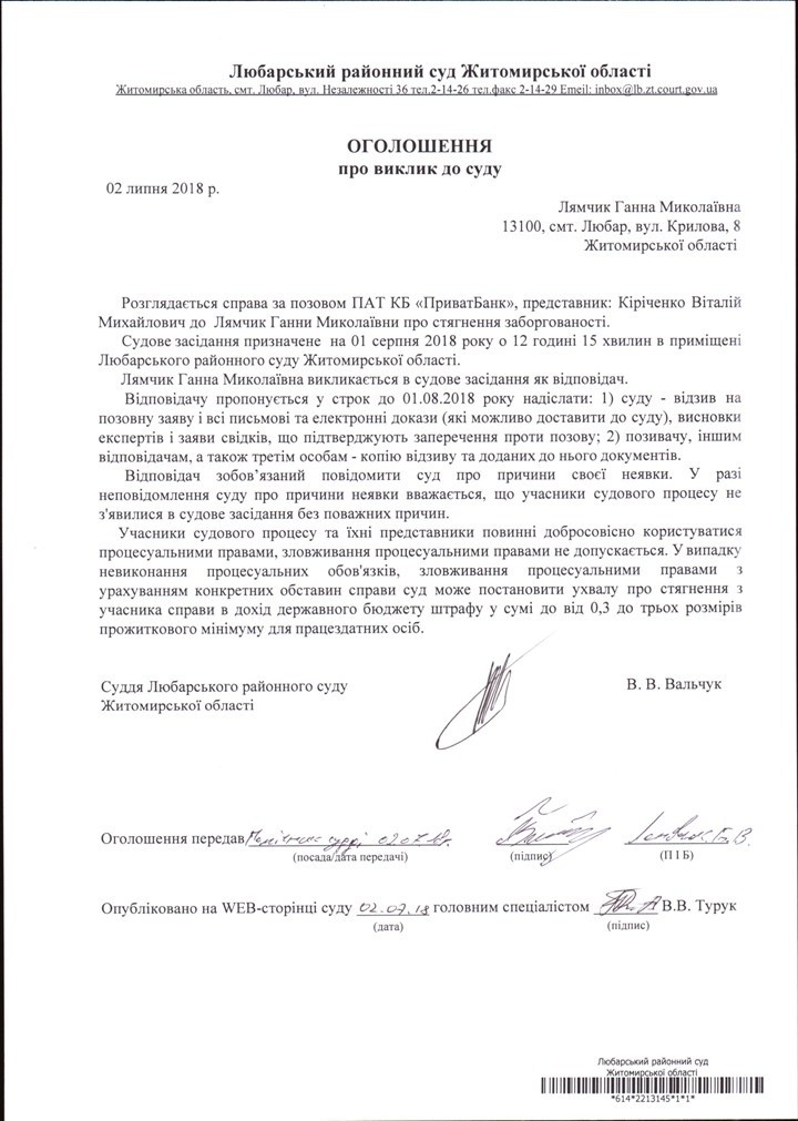 ОГОШЕННЯ про виклик до суду Лямчик Ганну Миколаївну