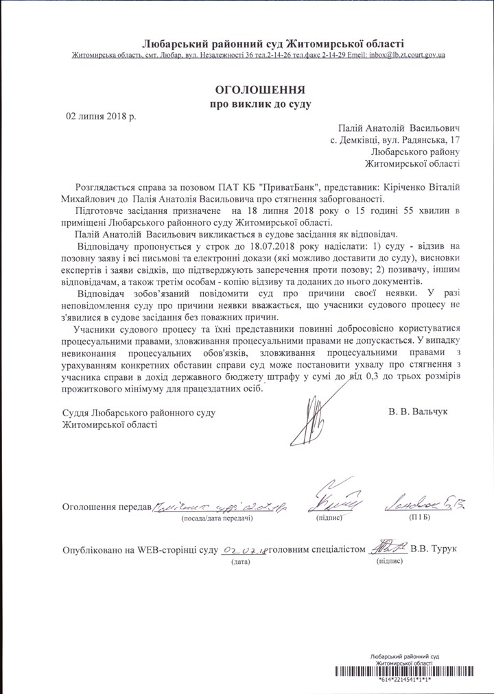 ОГОШЕННЯ про виклик до суду Палія Анатолія Васильовича
