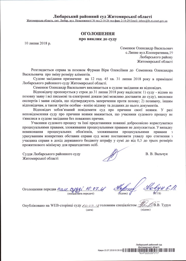 ОГОШЕННЯ про виклик до суду Семенюка Олександра Васильовича