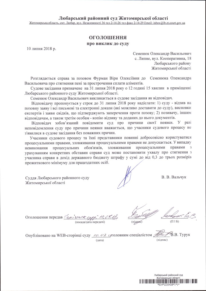 ОГОШЕННЯ про виклик до суду Семенюка Олександра Васильовича