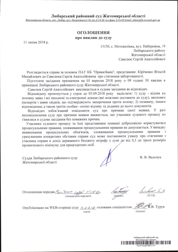 ОГОШЕННЯ про виклик до суду Савелюка Сергія Анатолійовича