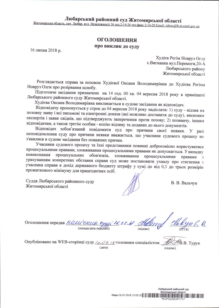 ОГОШЕННЯ про виклик до суду Худієва Регіма Новруз Огли