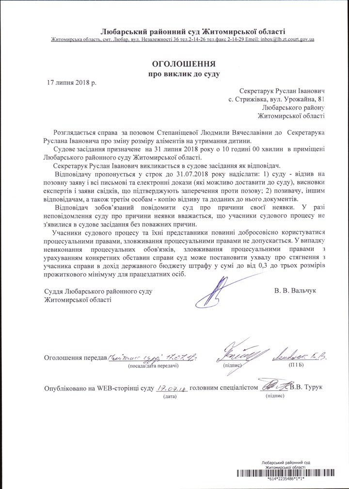 ОГОШЕННЯ про виклик до суду Секретарука Руслана Івановича