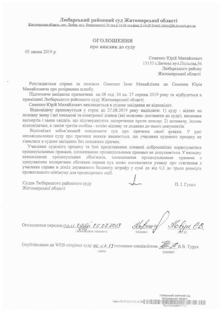 ОГОШЕННЯ про виклик до суду Семенка Юрія Михайловича