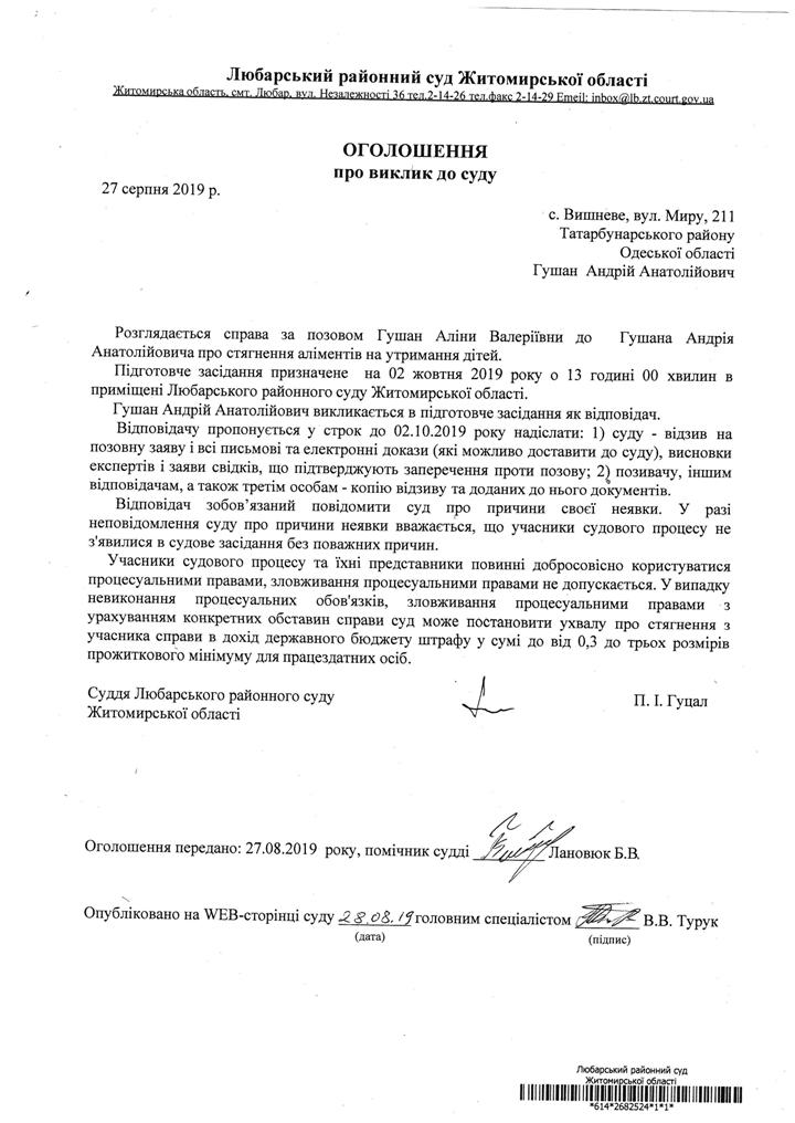 ОГОШЕННЯ про виклик до суду Гушана Андрія Анатолійовича