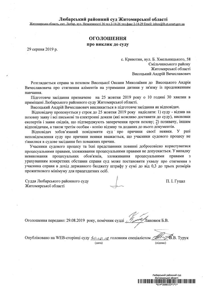 ОГОШЕННЯ про виклик до суду Висоцького Андрія Вячеславовича