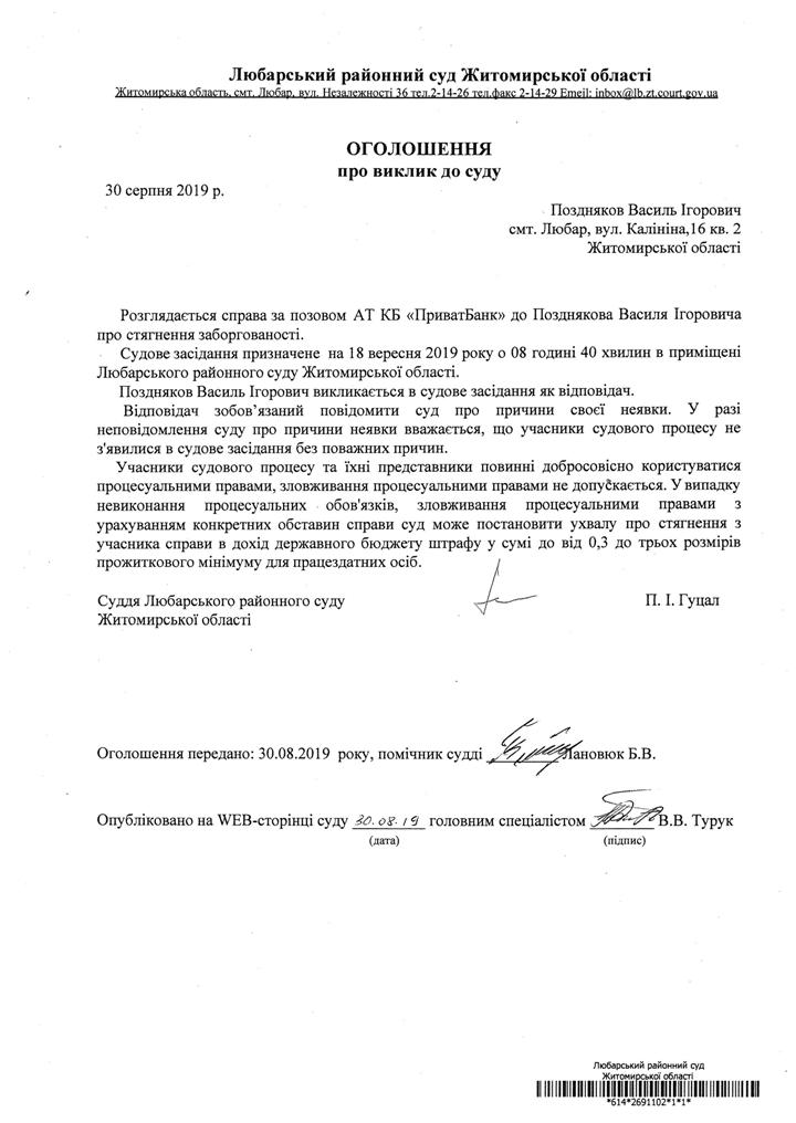ОГОШЕННЯ про виклик до суду Позднякова Василя Ігоровича