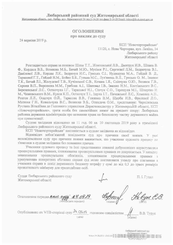 ОГОШЕННЯ про виклик до суду КСП " Новочорторийське"