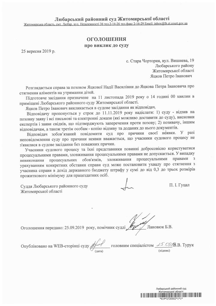 Оголошення про виклик до суду Яцкова Петра Івановича