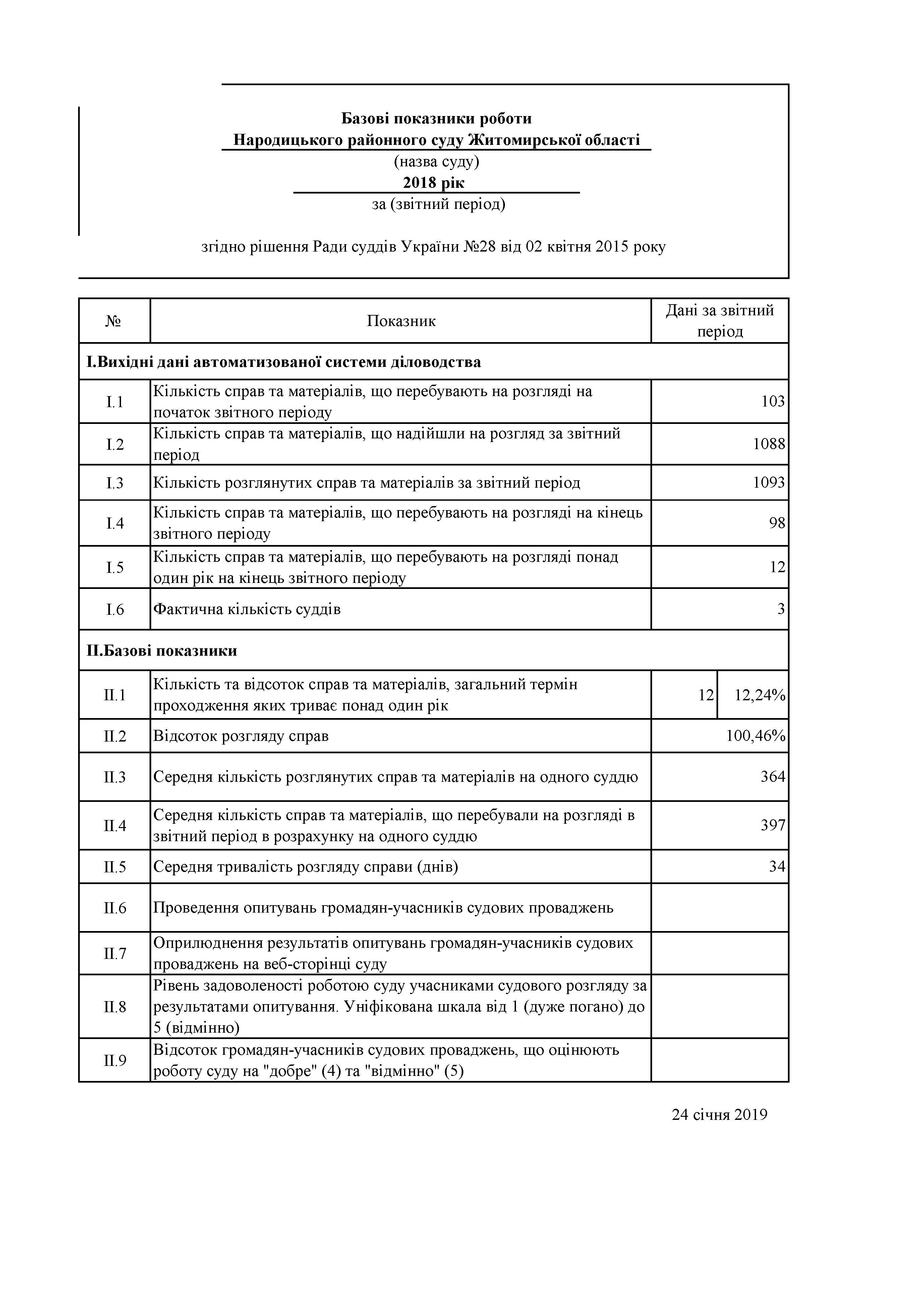 На виконання рішення Ради суддів України від02.04.2015 року № 28 Народицький районний суд Житомирської області інформує про базові показники роботи суду за 2018 рік.