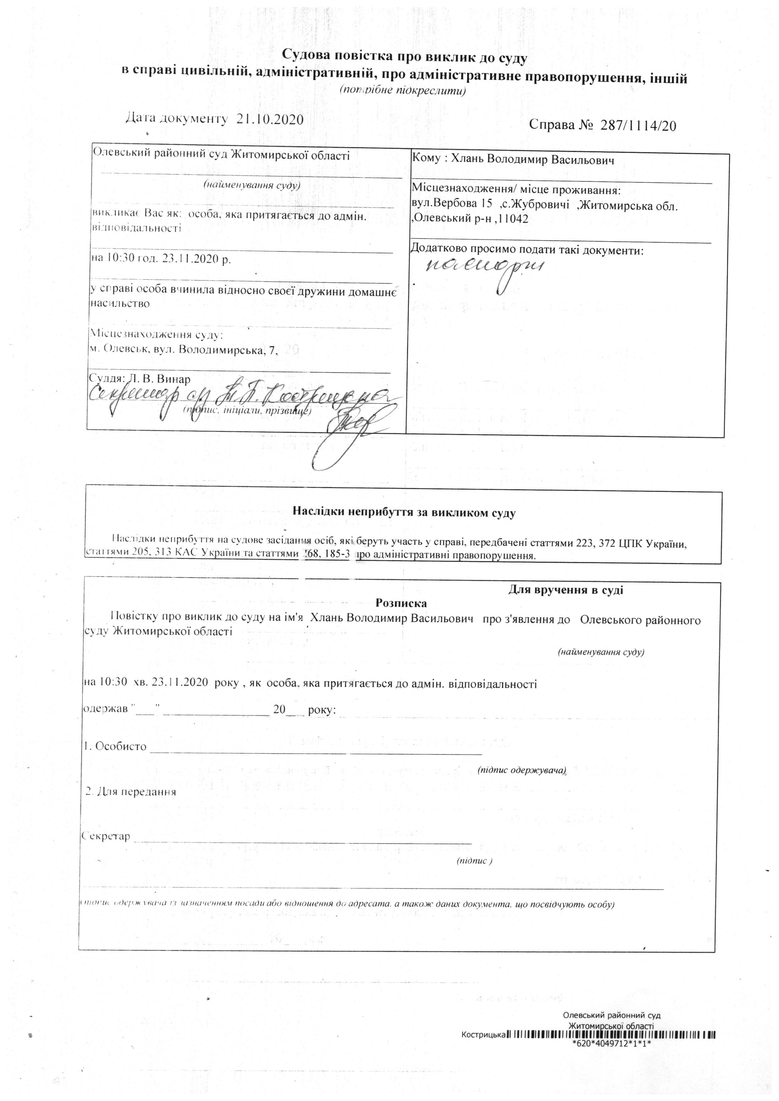 Олевський районний суд Житомирської області викликає Хлань Володимир Васильович у справі № 287/1114/20