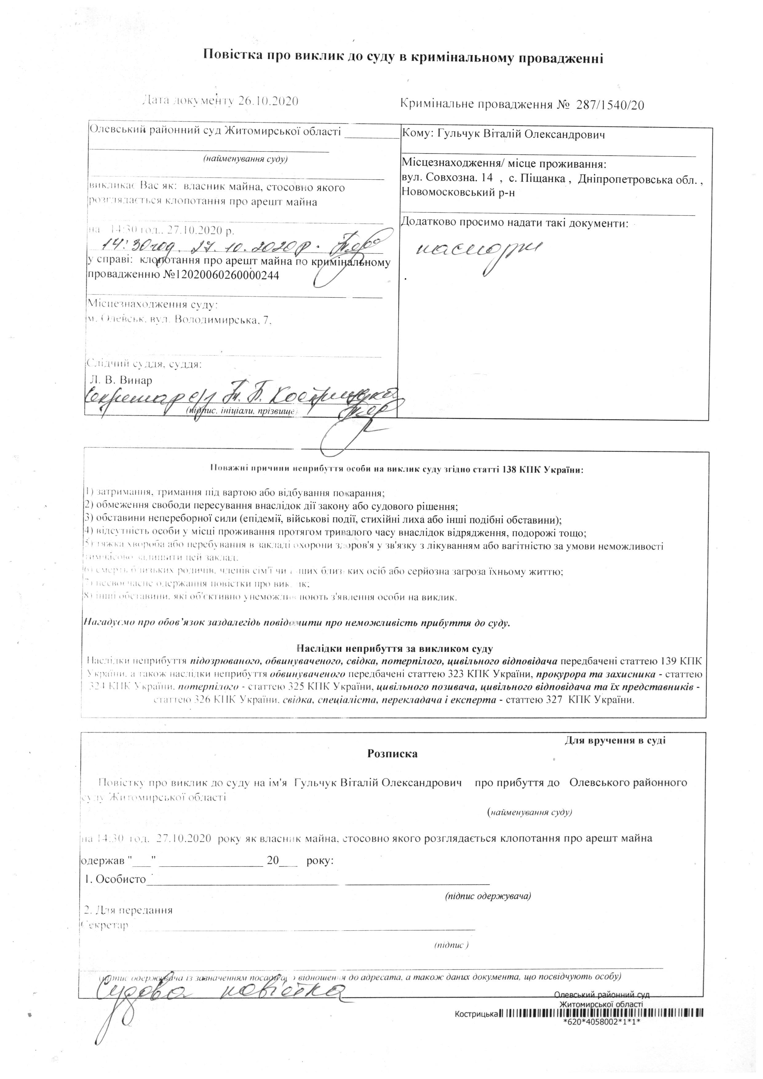 Олевський районний суд Житомирської області викликає Гульчук Віталій Олександрович у справі № 287/1540/20