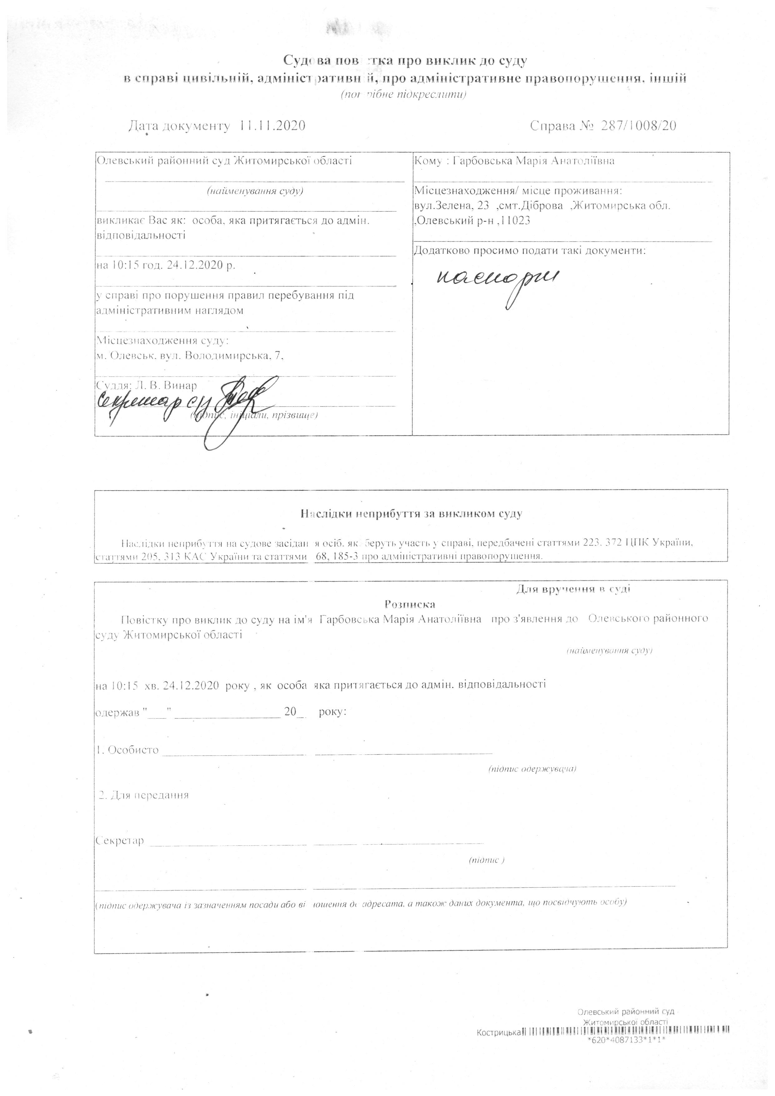 Олевський районний суд Житомирської області викликає Гарбовська Марія Анатоліївна у справі № 287/1008/20