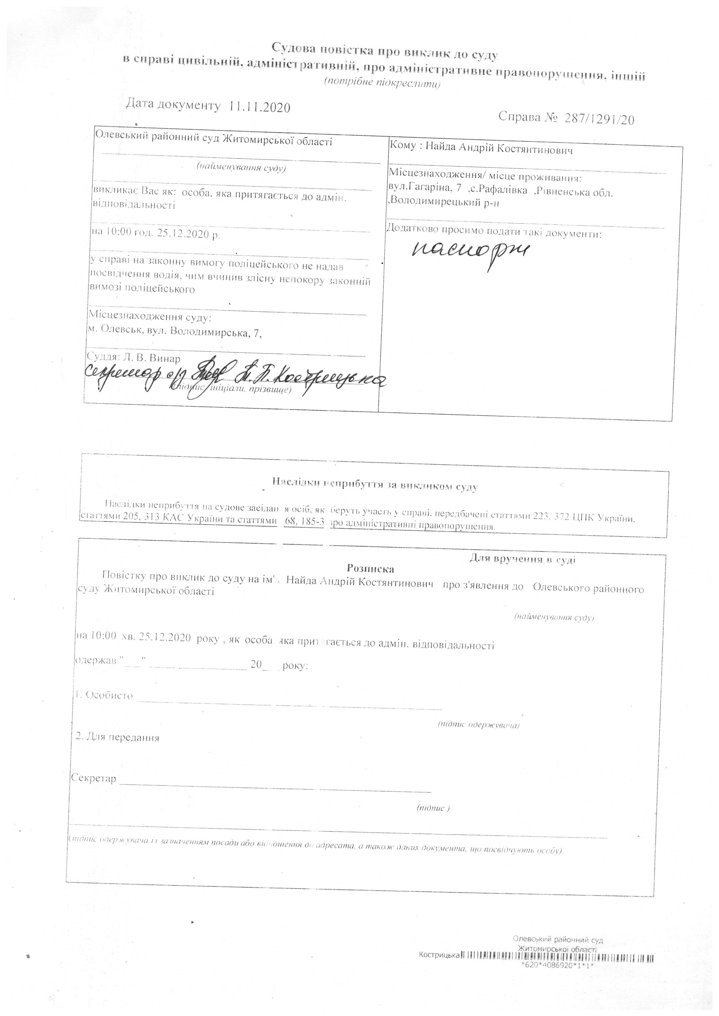 Олевський районний суд Житомирської області викликає Найда Андрій Костянтинович у справі № 287/1291/20